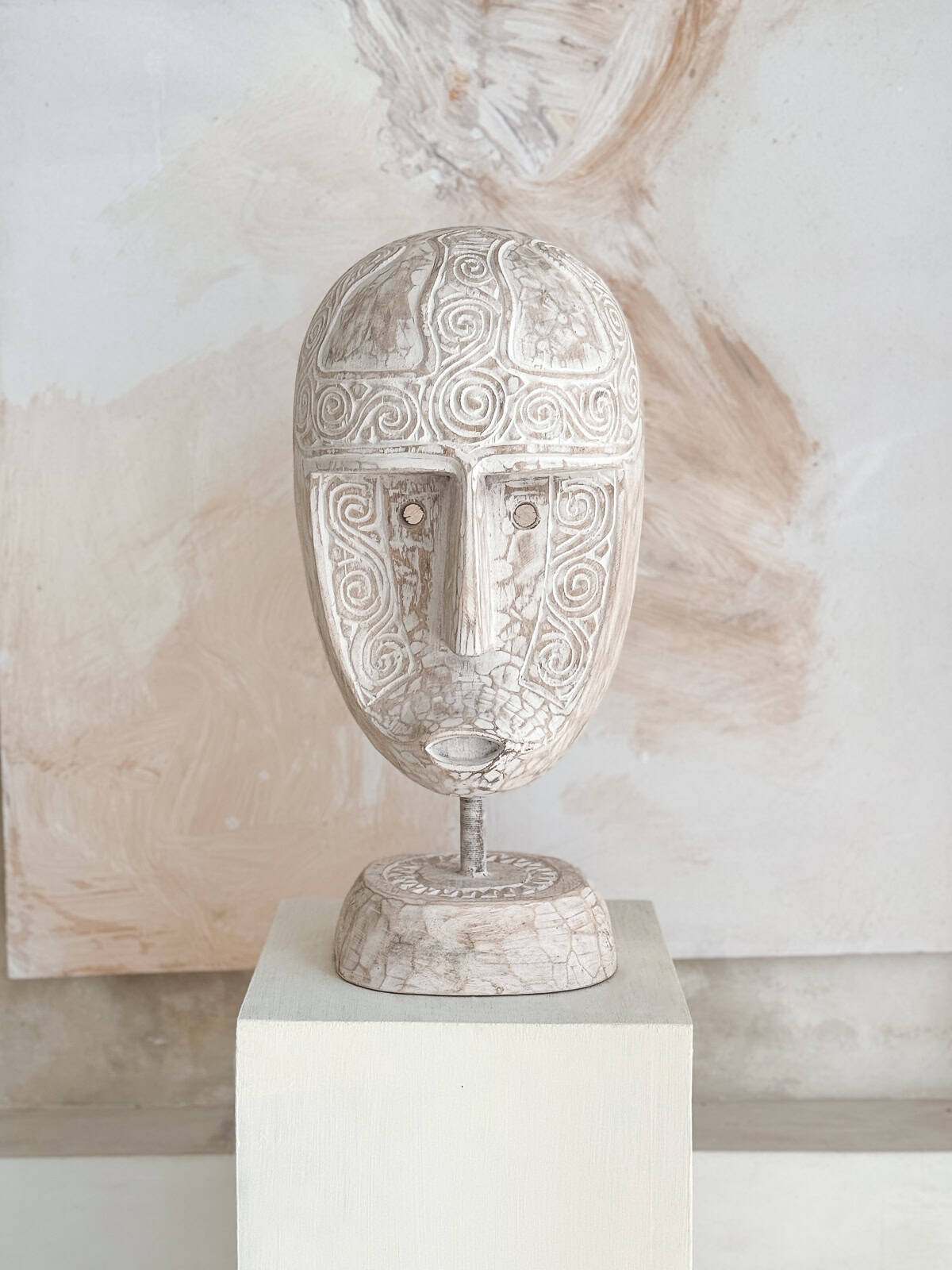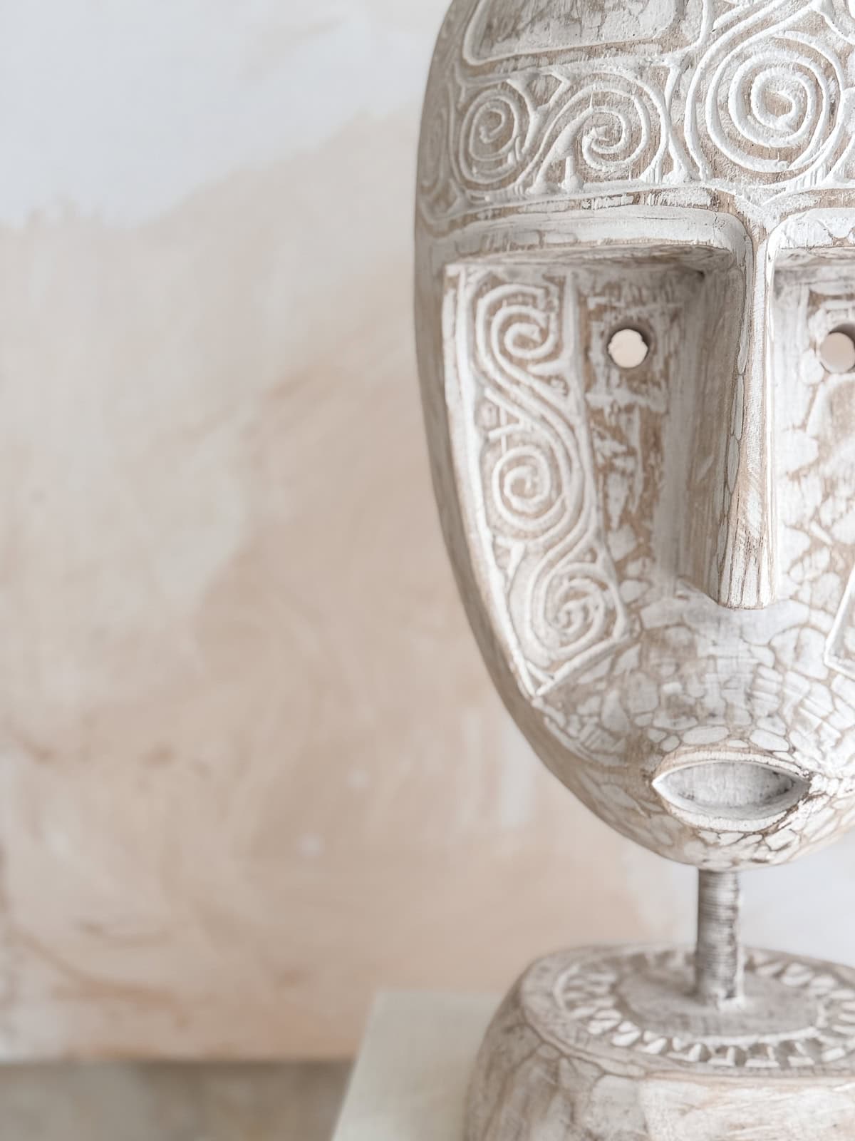 Die Holzmaske ist von afrikanischer Ästhetik inspiriert, wurde jedoch auf Bali geschnitzt – dort, wo das Schnitzhandwerk lebendige Tradition ist. Als freistehendes Objekt macht sie auf Konsole, Regal oder im Home-Office eine markante Figur.