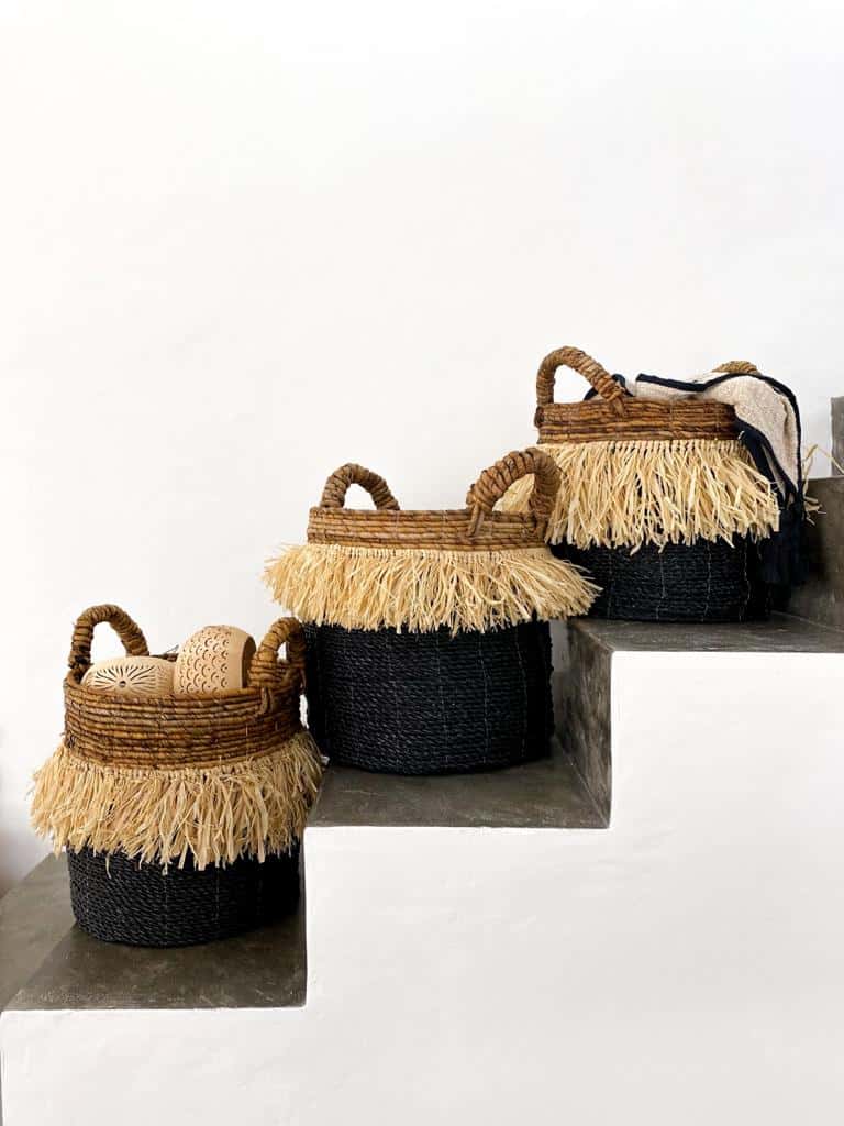 Boho-Körbe sind ein Set aus 3 handgefertigten Accessoires, in denen Sie verschiedene Dinge aufbewahren können. Hergestellt aus soliden Materialien mit Zusatz von dekorativen Bambuspalmenblättern. Unsere dekorativen Körbe können im Badezimmer oder im Wohnzimmer aufgestellt werden. Sie können auch einen großen Topf mit einer Pflanze hineinstellen und so eine interessante Dekoration schaffen. Jedes von ihnen wurde auf Bali in einem kleinen Familienbetrieb handgewebt.