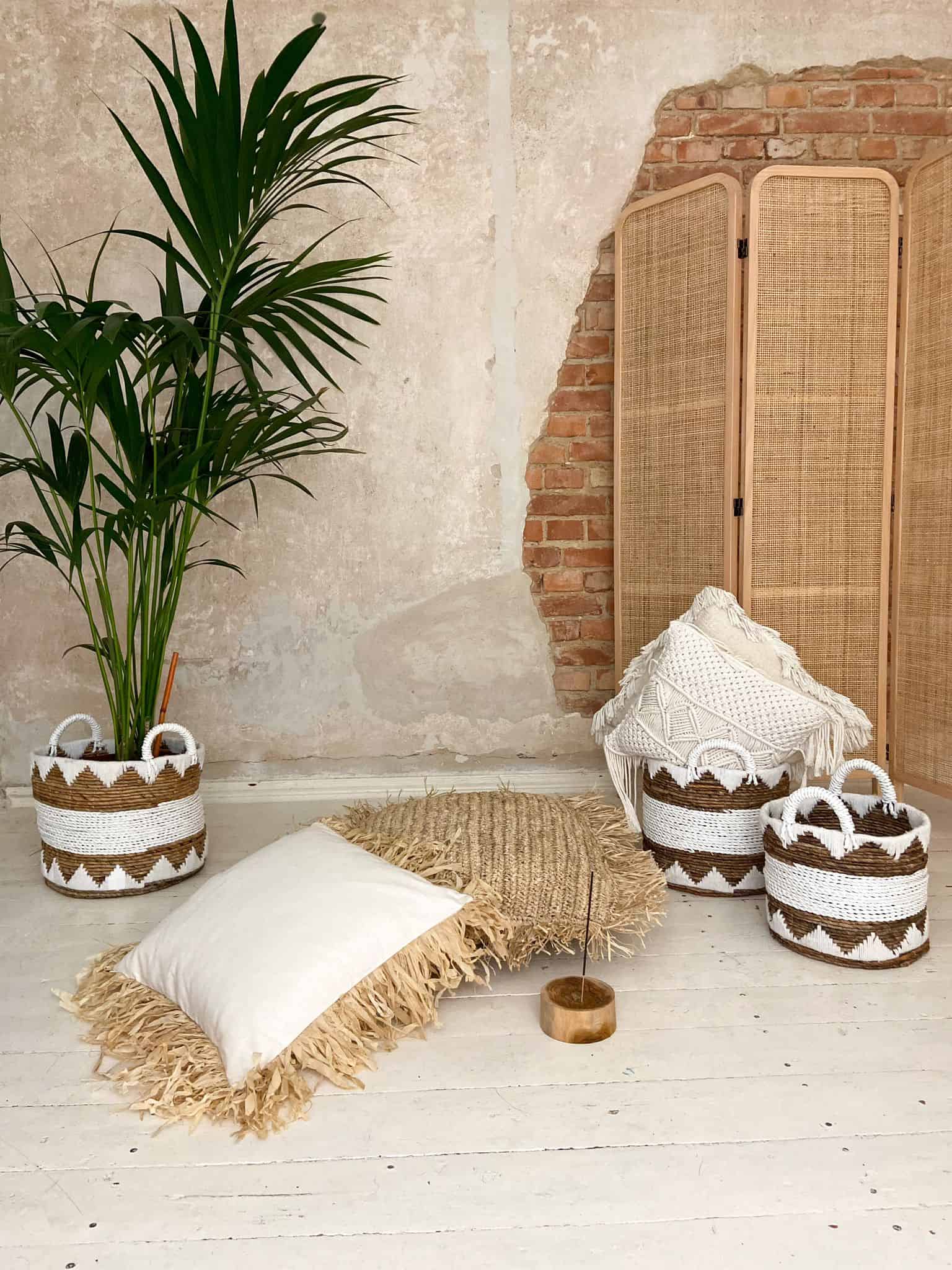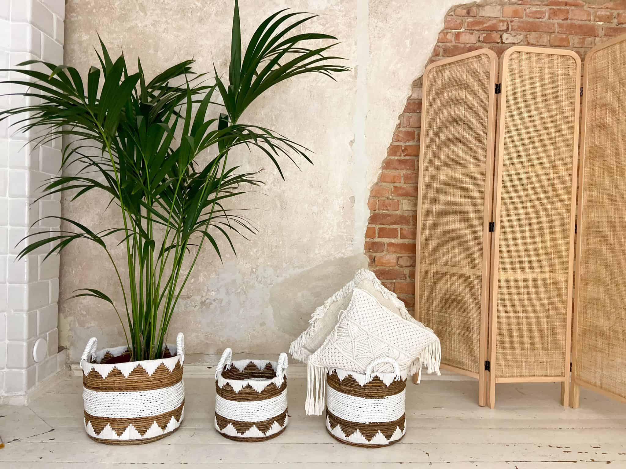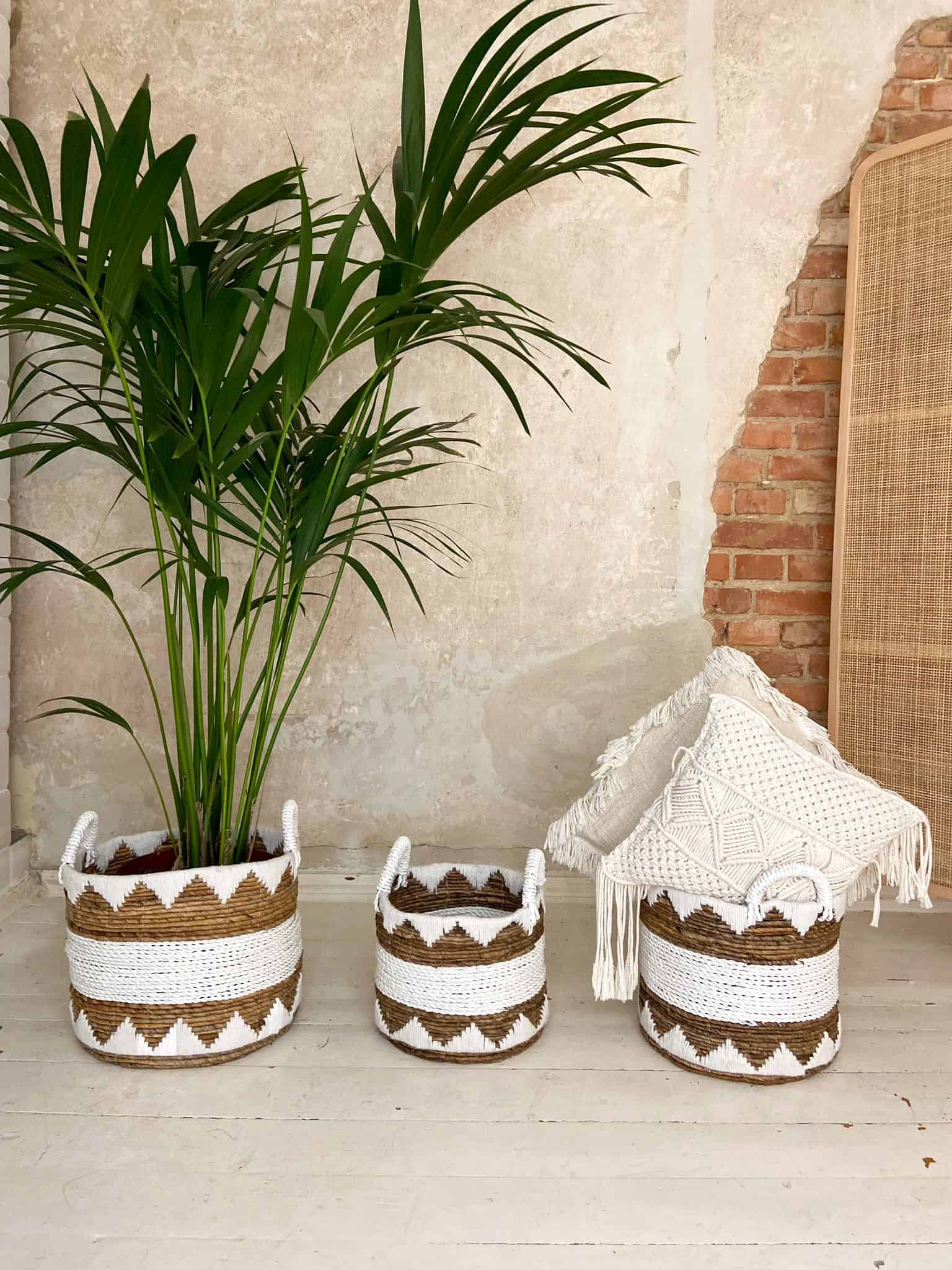 Boho-Körbe sind ein Set aus drei einzigartigen, handgewebten Dekorationen. Sie können es als klassische Boho-Dekoration verwenden oder im Badezimmer platzieren und dort Ihre Kleidung aufbewahren. Er kann auch als Boho-Blumenkorb verwendet werden. Stellen Sie ein paar Blumentöpfe hinein und es wird ihm einen coolen Charakter verleihen.