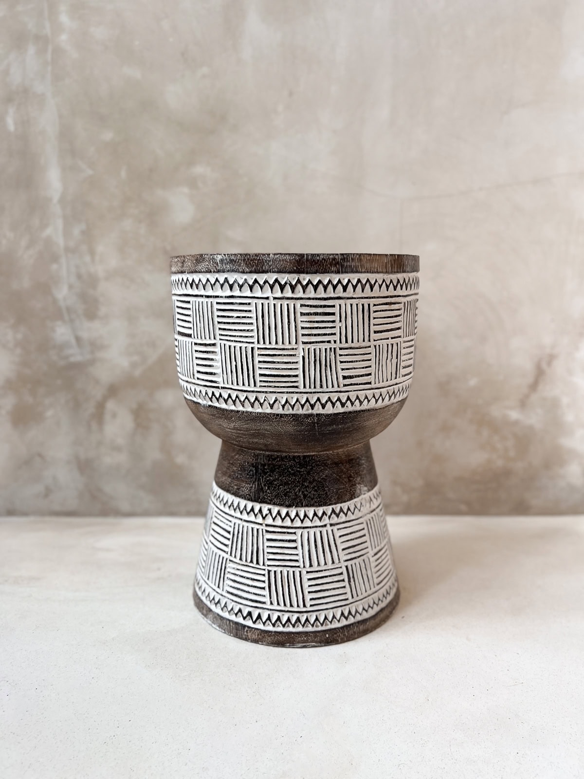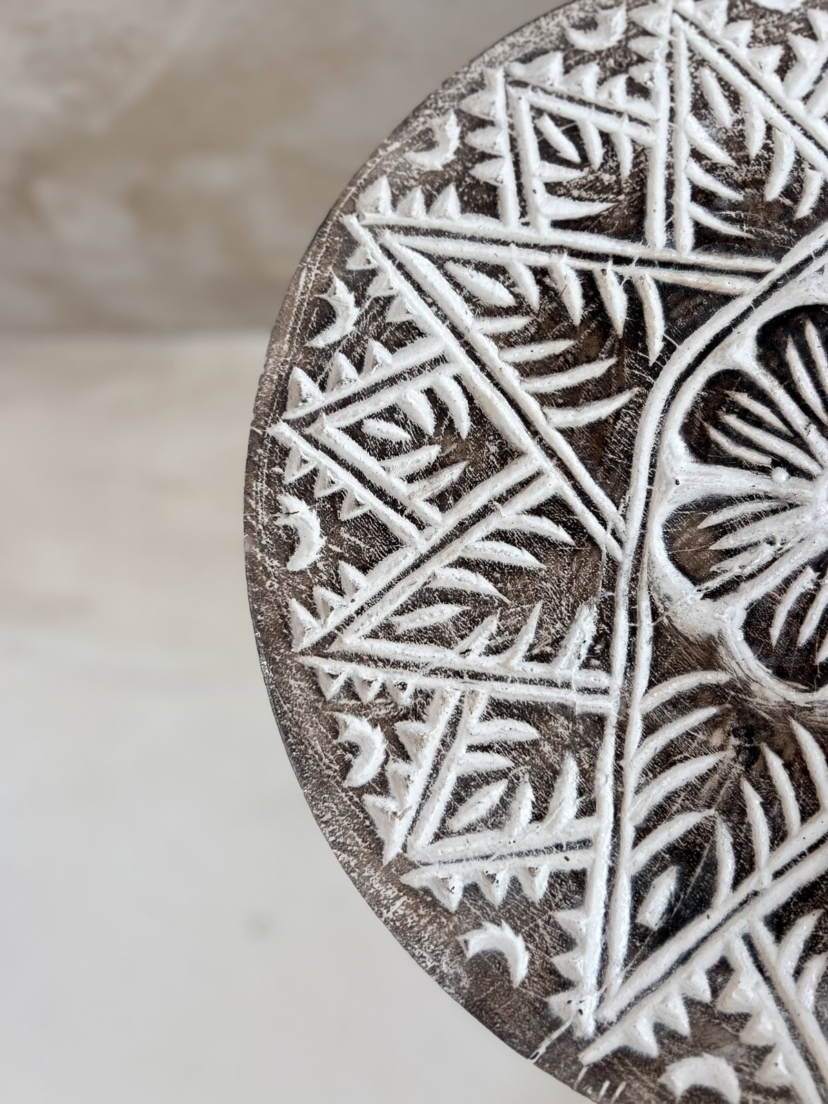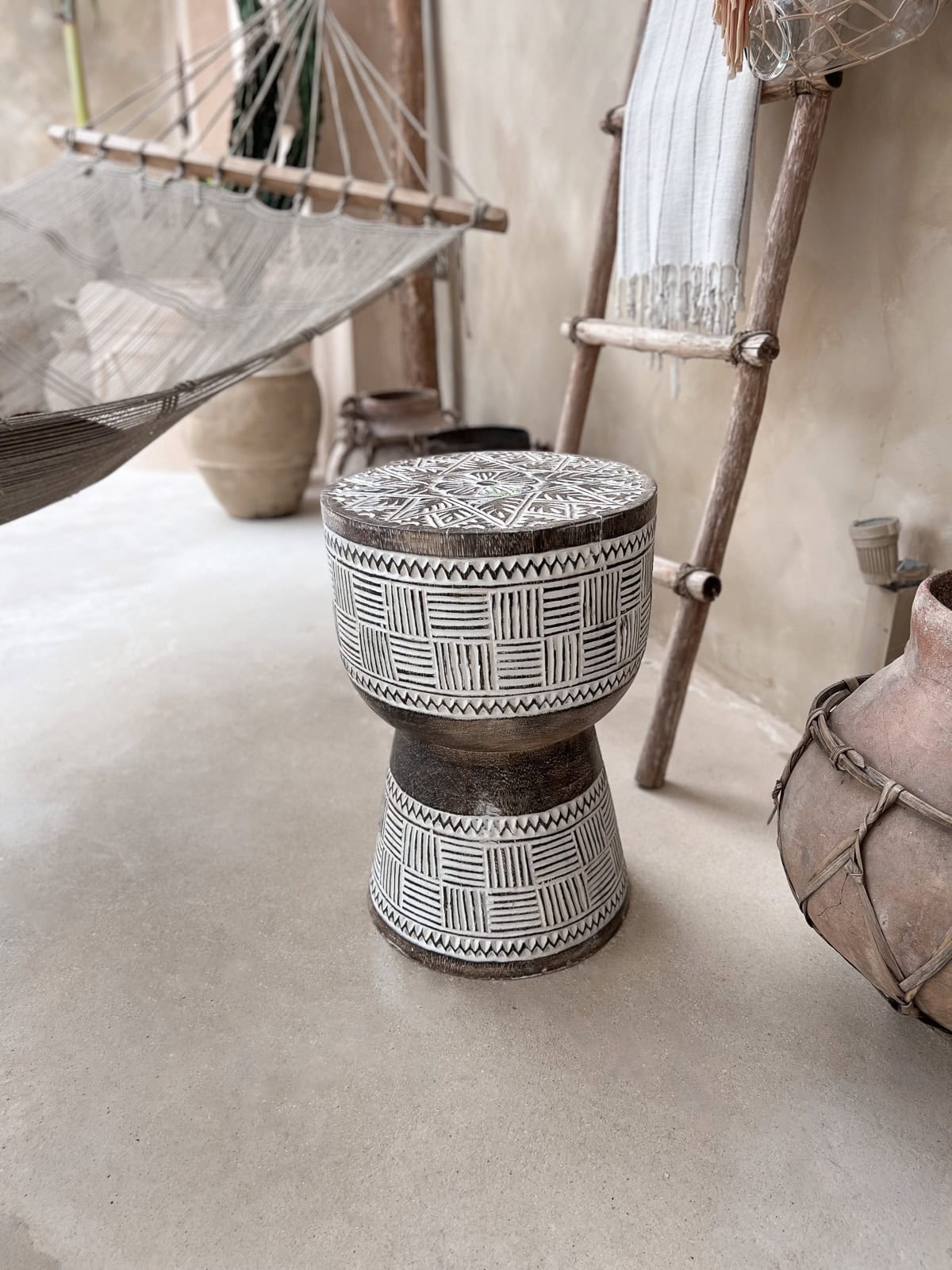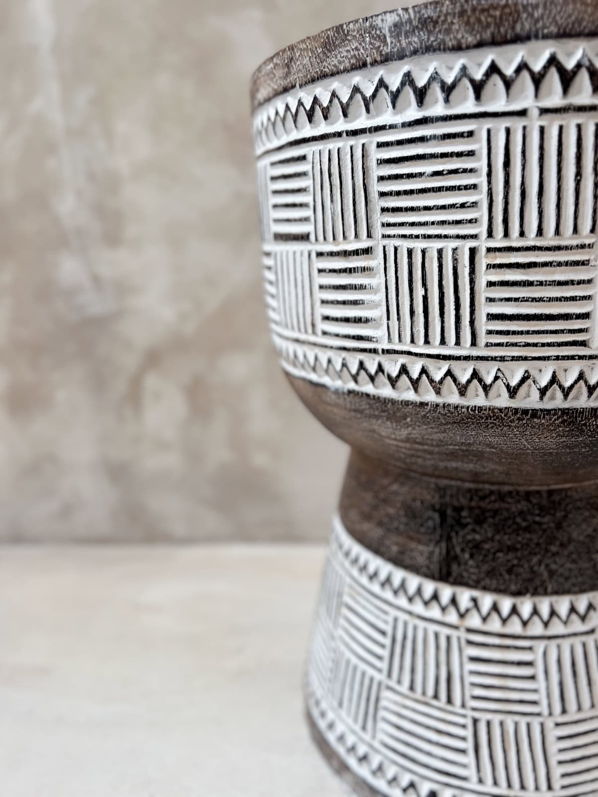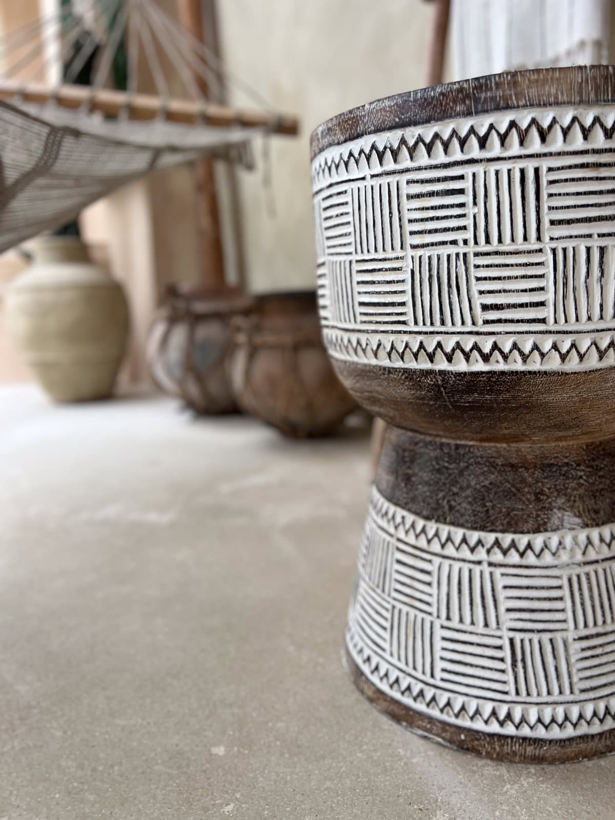 Nutzbar als Beistelltisch, Nachttisch oder Podest für Pflanzen. Die solide Form und die einzigartigen Schnitzereien setzen einen ethnischen Akzent – ideal für Wohnzimmer, Schlafzimmer, Terrasse oder Eco- & Rustic-Spaces.