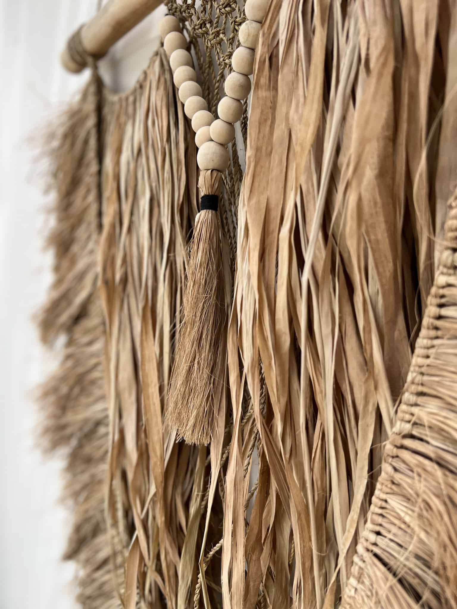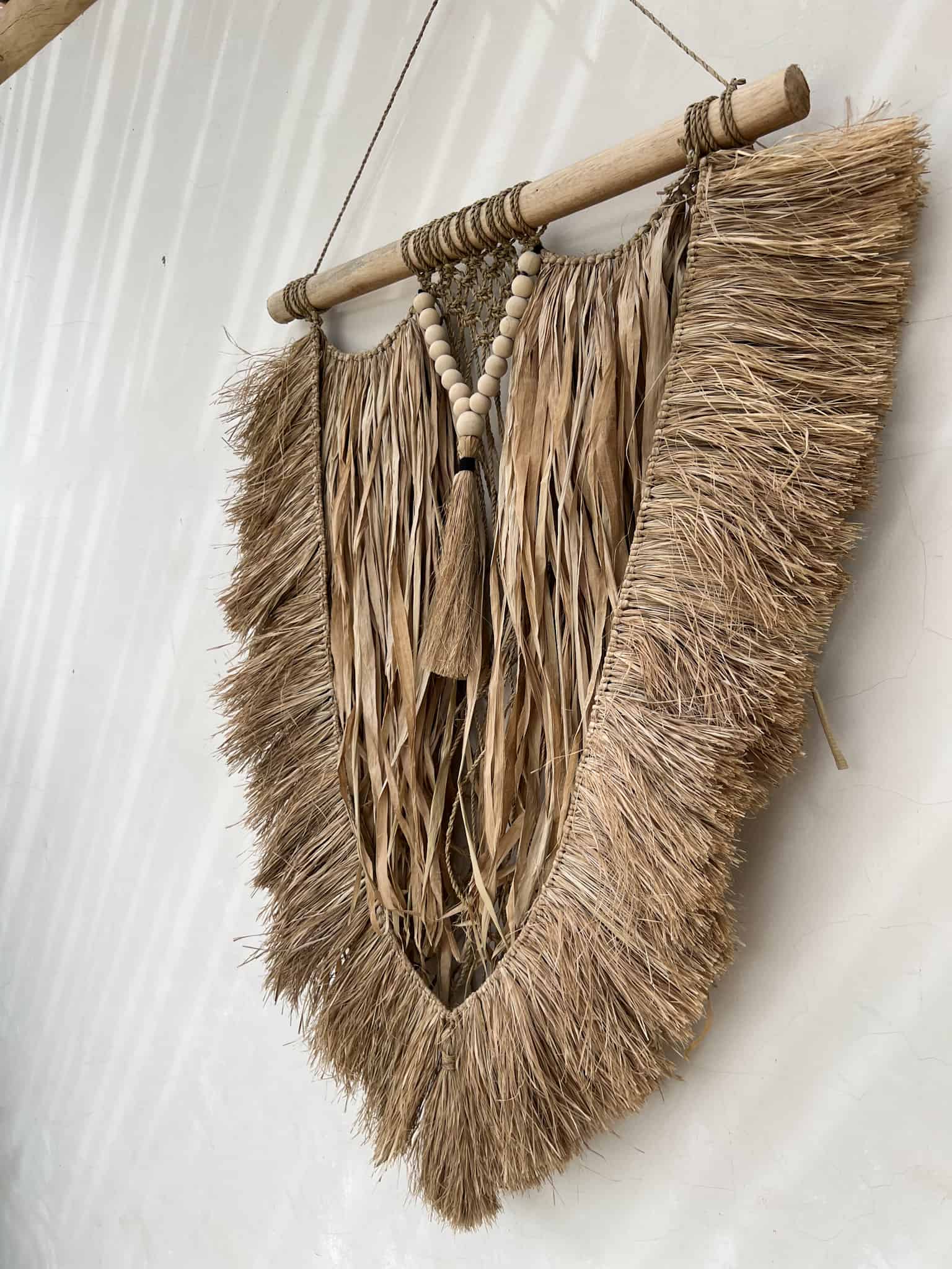 Boho Dekoration RIO vereint in sich die lebendige Essenz des Boho-Stils mit der authentischen Handwerkskunst Balis. Diese handgemachte, ethnische Dekoration ist ein Ausdruck der kulturellen Vielfalt und der handwerklichen Präzision, die Bali zu bieten hat. Gefertigt aus umweltfreundlichen Materialien, steht RIO für das Engagement für Nachhaltigkeit und Einzigartigkeit. Die Dekoration mit einer Gesamtlänge von 105cm, einschließlich des 25cm langen Anhängers, und einer Breite von 60cm, macht ein beeindruckendes Statement in jedem Raum. RIO ist nicht nur eine Dekoration, sondern ein Kunstwerk, das Wärme, Stil und die Philosophie eines bewussten Lebensstils in dein Zuhause bringt.