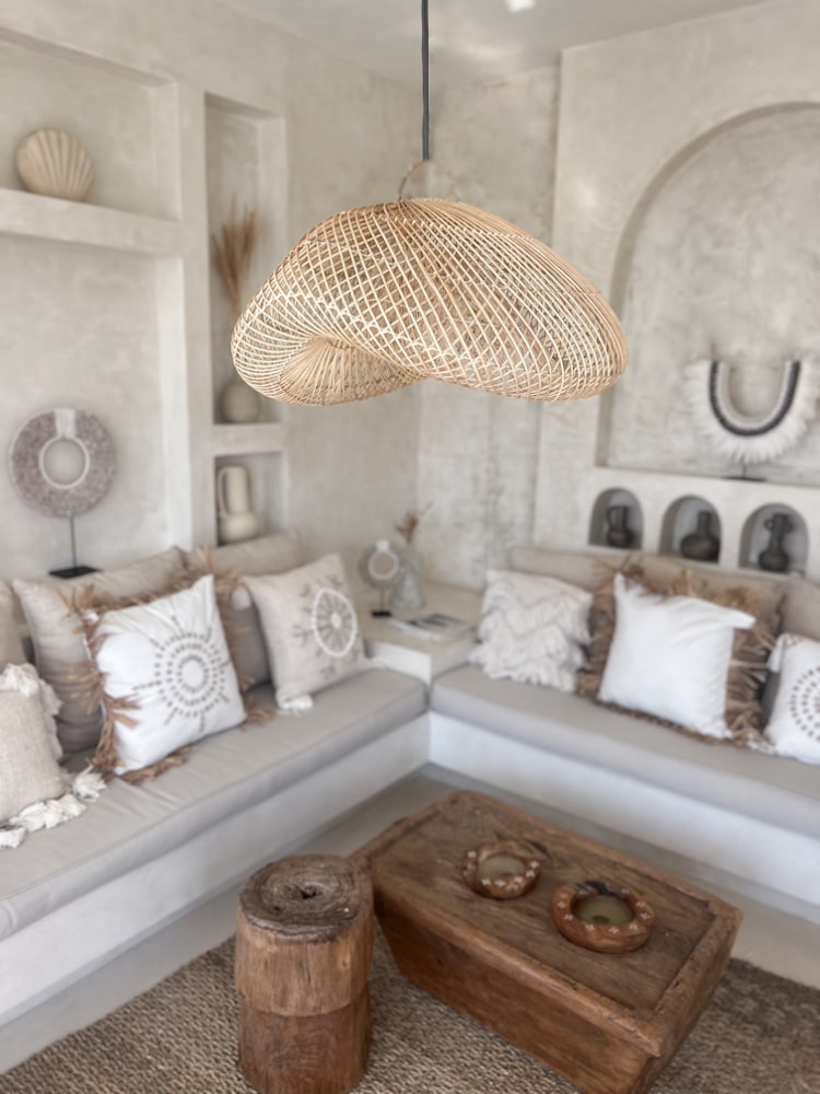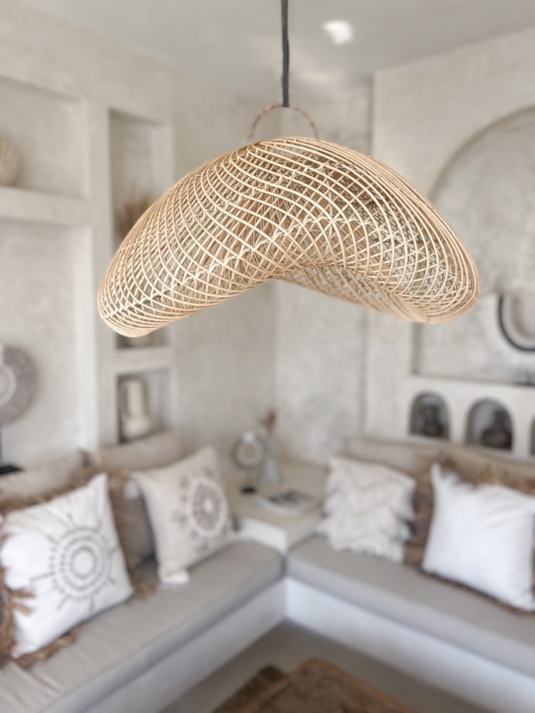 Die Boho Rattan Lampe BERANI M beeindruckt mit einem Durchmesser von 60cm. Handgefertigt aus hochwertigem Rattan, strahlt diese Lampe eine natürliche Schönheit aus, die jeden Raum in ein gemütliches Ambiente taucht.