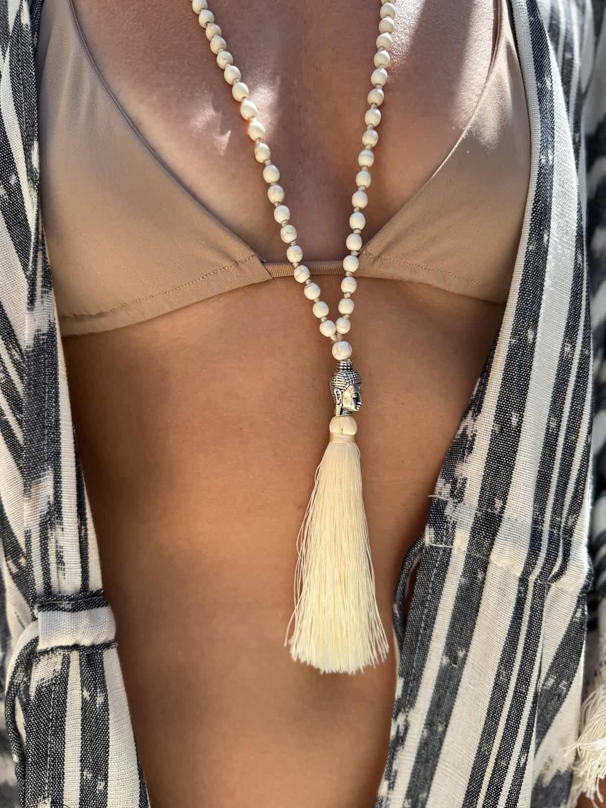 Beiger Halskette aus natürlichen Steinen – ein Schmuckstück voller Ruhe, Balance und spiritueller Energie. Im Mittelpunkt steht das Buddha-Symbol, das seit Jahrhunderten für Achtsamkeit, innere Harmonie und Weisheit steht. Diese handgefertigte Halskette aus Bali wurde von lokalen Kunsthandwerkern mit viel Liebe zum Detail gefertigt – jedes Element trägt ihre Hingabe und ihr Können in sich.