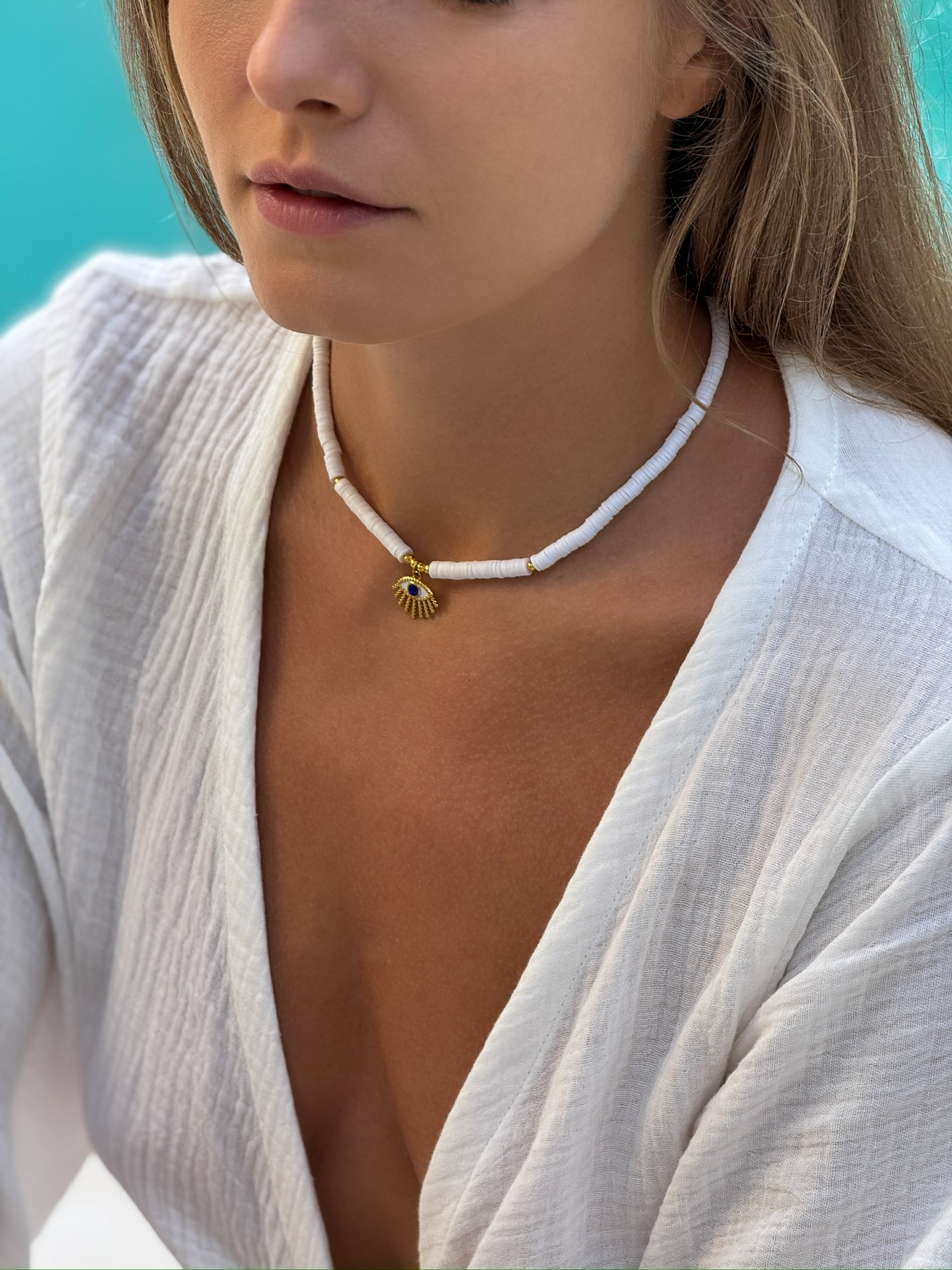 Choker-Halskette DEEP Weiß – ein feines, handgefertigtes Accessoire für alle, die Schlichtheit mit Bedeutung schätzen. Der zarte, weiße Choker wird von einem kleinen Auge-des-Propheten-Anhänger geziert – einem Symbol für Schutz, Achtsamkeit und positive Energie. Unaufdringlich und elegant zugleich, bringt er ein dezentes Highlight in jeden Look – ob zu Jeans und Bluse oder zu einem leichten Sommerkleid.