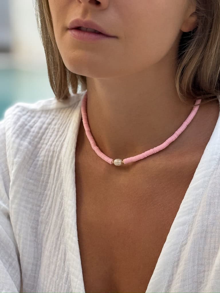 Dieser rosa Choker passt perfekt zu femininen, romantischen oder lässigen Outfits und ist ideal für alle, die zarten Schmuck mit einem dezenten, aber wirkungsvollen Detail schätzen. Die Kombination aus moderner Schlichtheit und klassischer Eleganz macht den Choker mit Perle zu einem vielseitigen Accessoire für jeden Anlass. Dank des verstellbaren Bandes lässt er sich individuell anpassen und bietet angenehmen Tragekomfort – leicht, unaufdringlich und stilvoll.