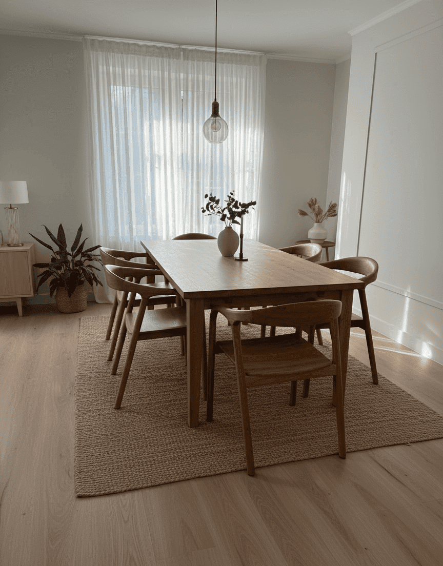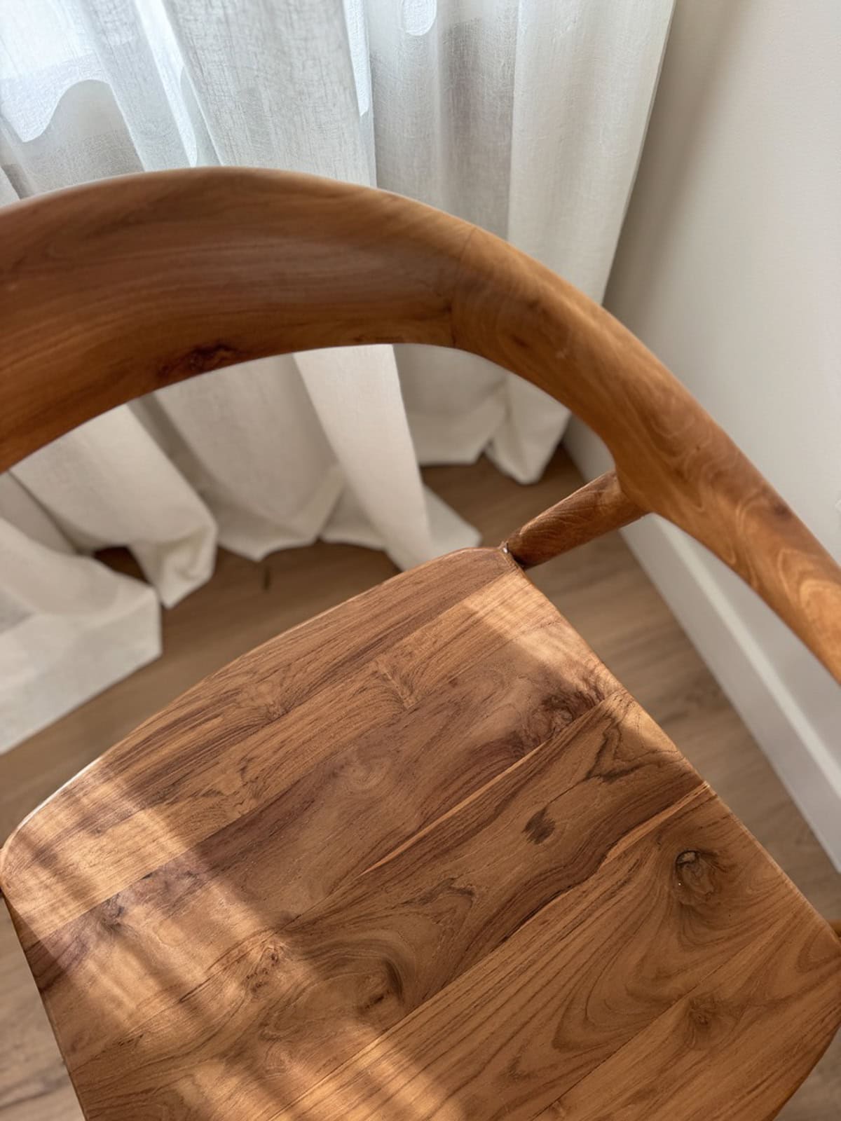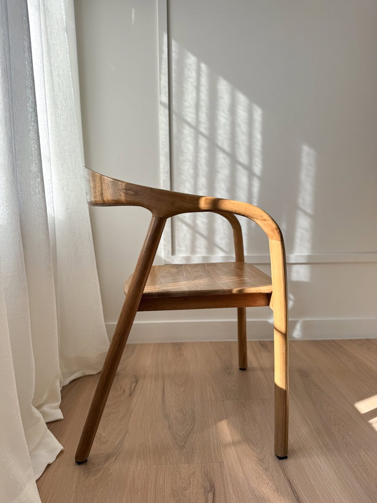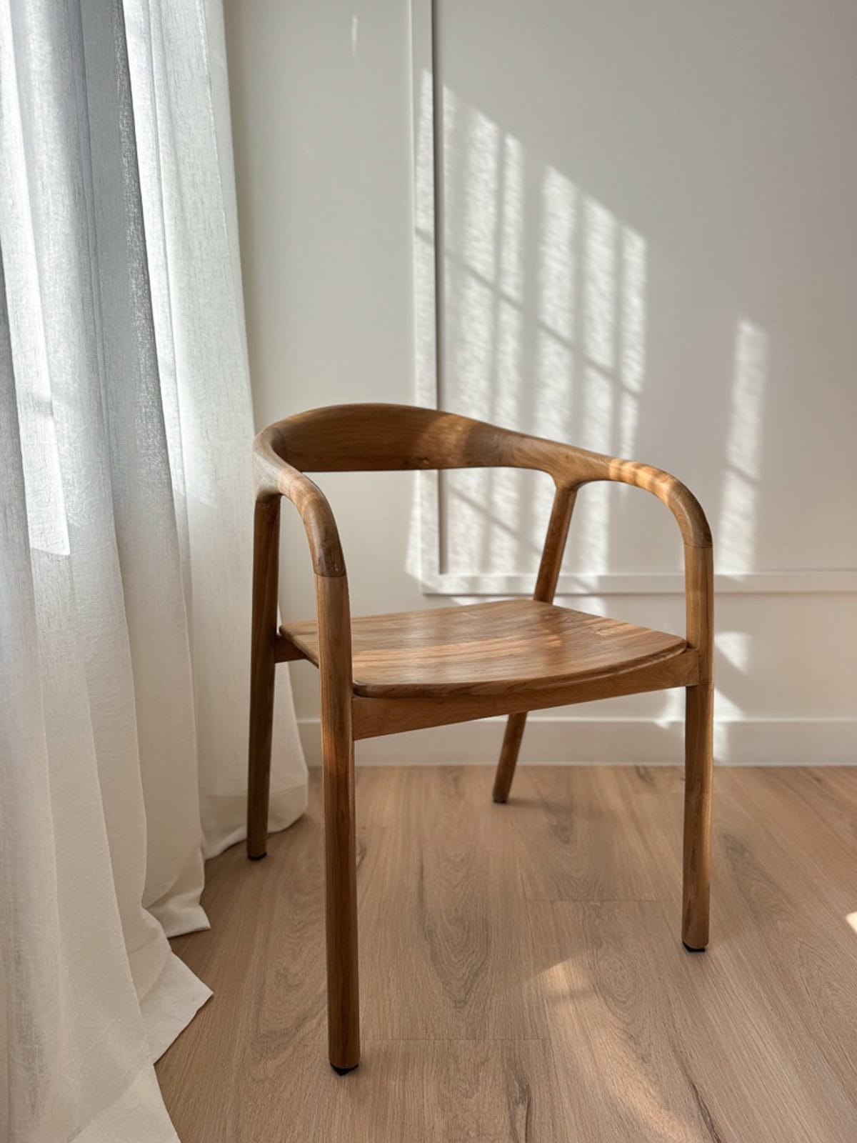 Der Holzstuhl fügt sich mühelos in Natur-, Japandi-, skandinavische und rustikale Einrichtungen ein. Dank der Robustheit von Teak eignet er sich auch für überdachte Outdoor-Bereiche.