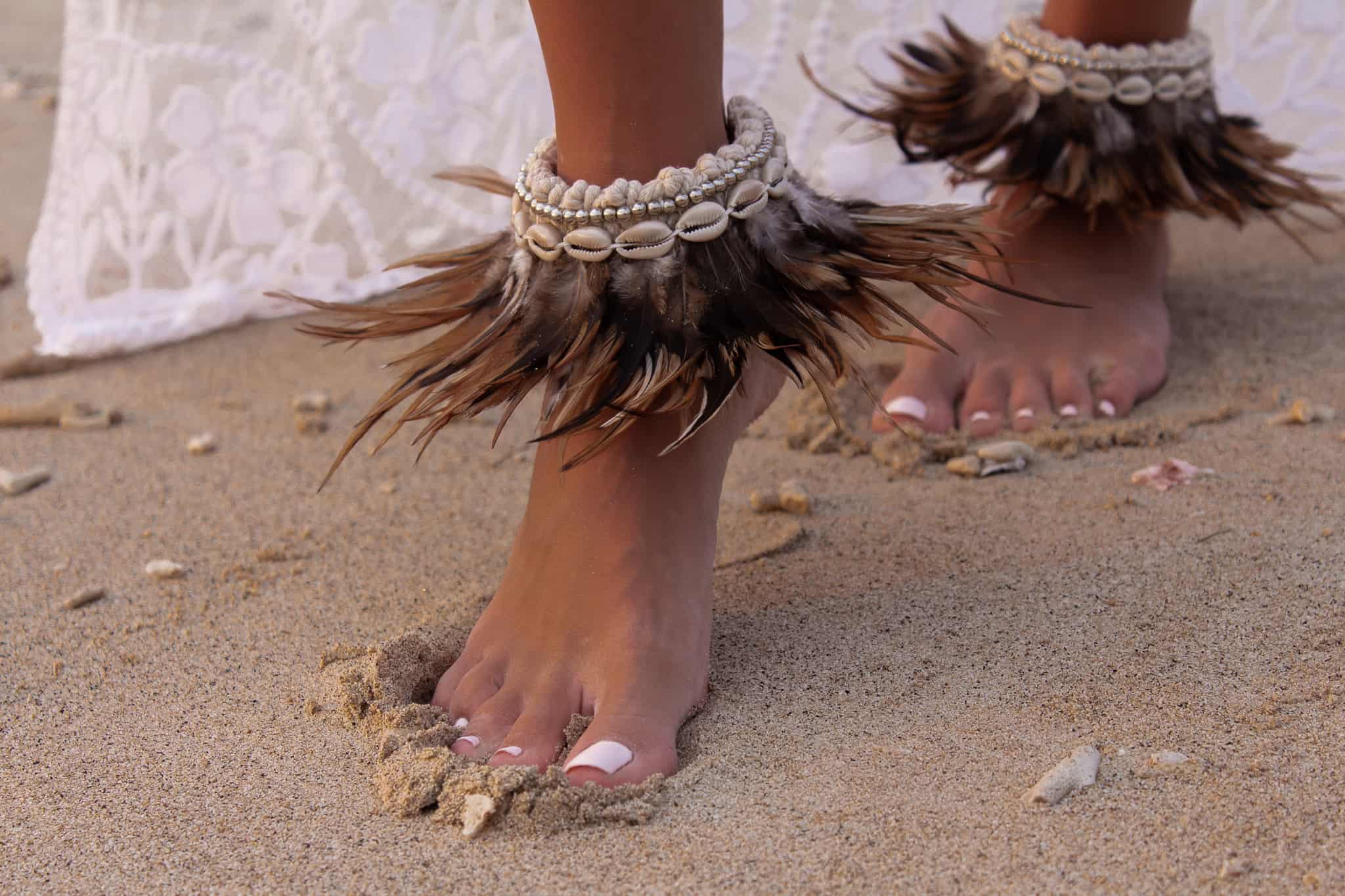 Fußkettchen aus Federn und Muscheln Dunkel – Dieses exklusive Fußkettchen, handgefertigt auf Bali, vereint dunkle Federn und Muscheln zu einem stilvollen Accessoire im Boho-Stil. Es bietet eine einzigartige Kombination aus dunklen Tönen, die sowohl Eleganz als auch einen Hauch von Mystik ausstrahlen, ideal für modebewusste Individualisten.