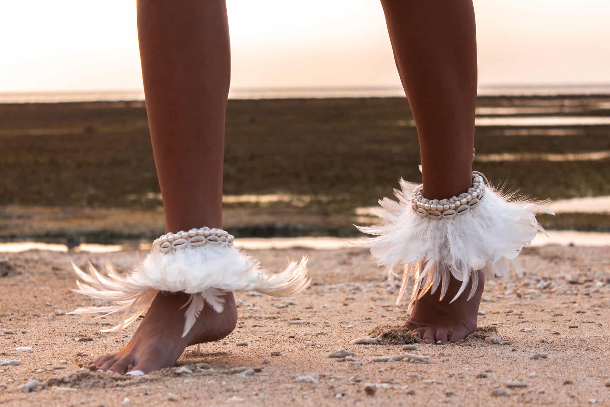 Beschreibung: Fußkettchen aus Federn und Muscheln Weiß