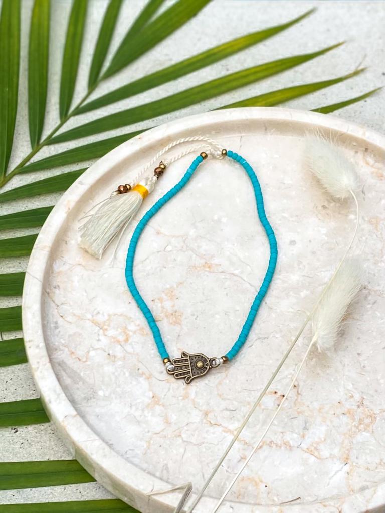 Fußkettchen FATIMA – Dieses handgefertigte Fußarmband von Bali trägt das Schutzsymbol Fatima und vereint spirituelle Bedeutung mit bohemischem Stil. Es ist ein Modeaccessoire, das nicht nur charismatisch und beschützend wirkt, sondern auch eine tiefere, spirituelle Dimension zu deinem Outfit hinzufügt. Die universelle Verstellbarkeit sorgt für perfekten Tragekomfort für jeden.
