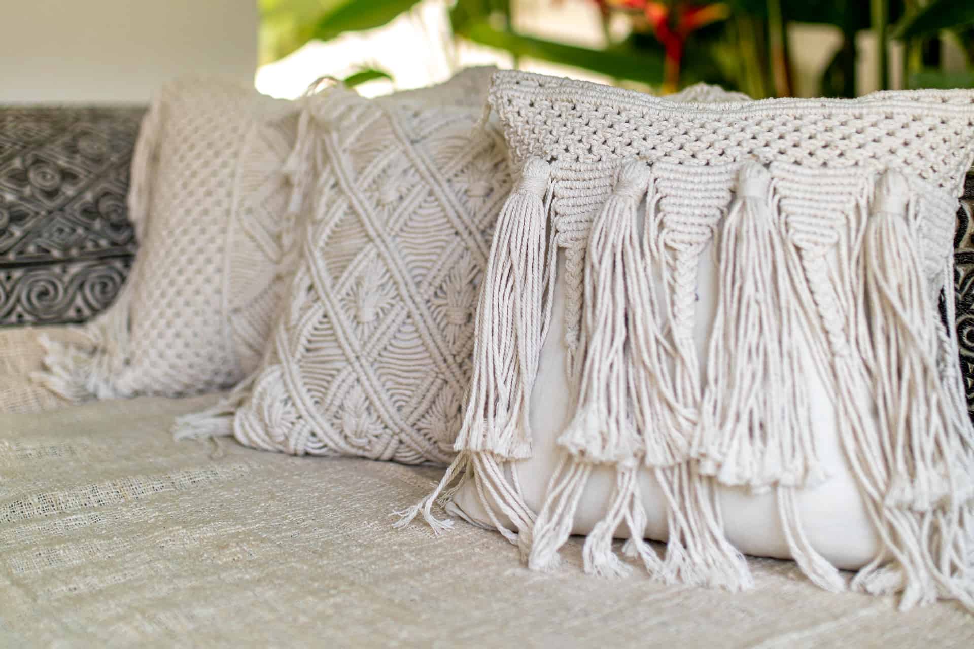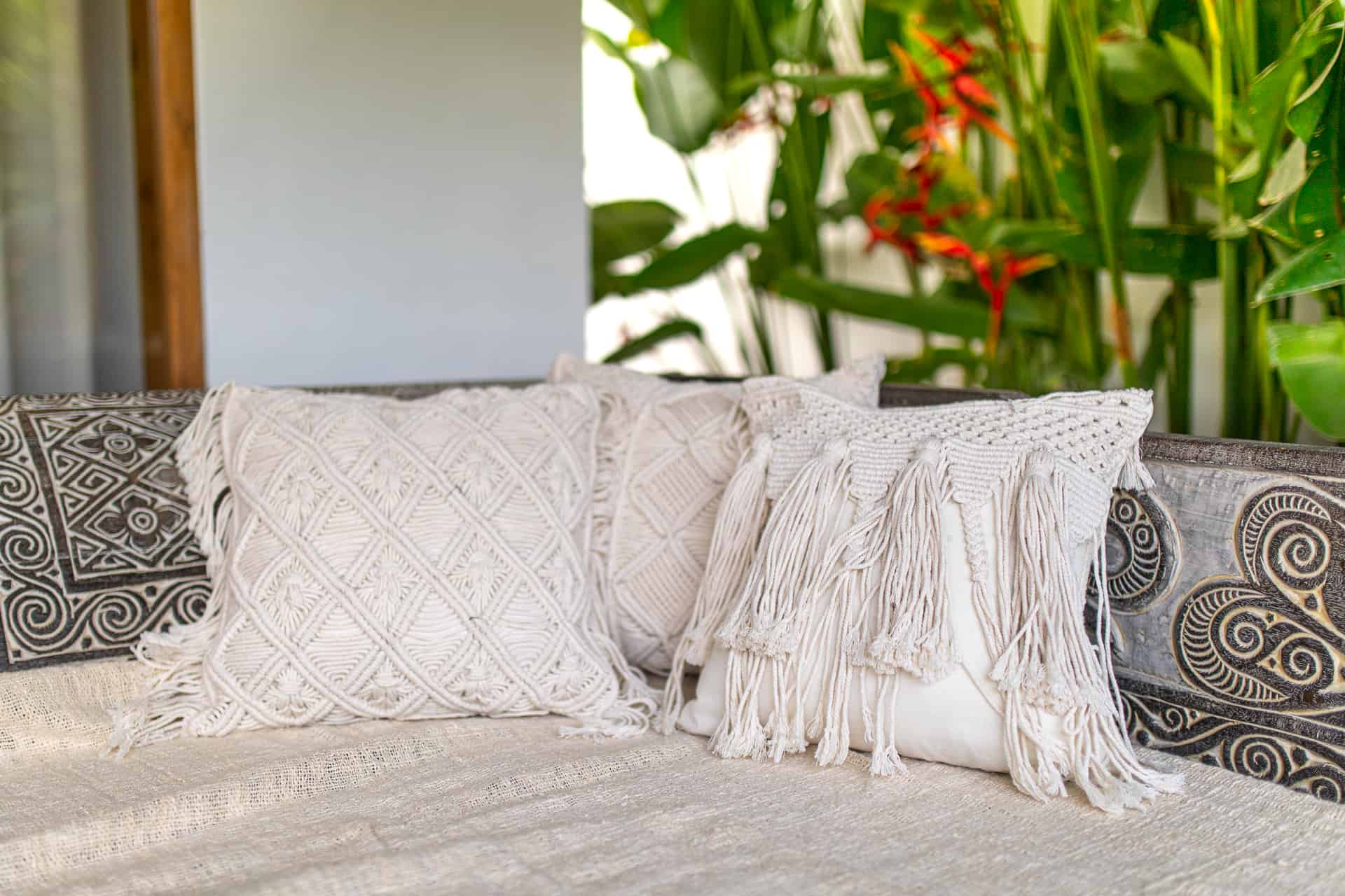 Geflochtene Makramee-Boho-Kissenbezug TIGA – Verwandele jeden Raum mit dem Makramee-Kissenbezug TIGA, handgewebt von balinesischen Kunsthandwerkern. Dieses Stück repräsentiert ökologische Wohnkultur und nachhaltige Produktion, eingebettet in ein geflochtenes Kissen Design, das sowohl authentisch als auch bohemian ist. Ideal für alle, die Wert auf Authentizität und nachhaltige Heimdekoration legen, bringt dieser Kissenbezug ein Stück balinesische Tradition und handwerkliche Perfektion in dein Zuhause.