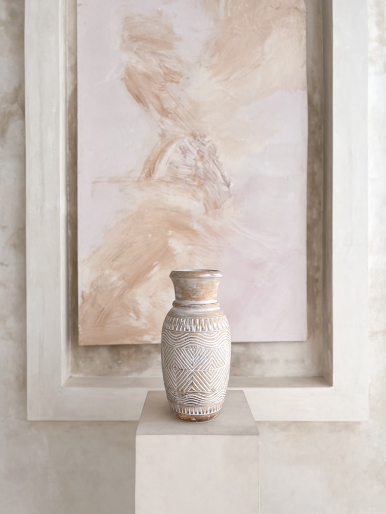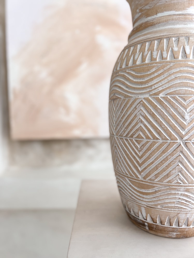 Ein weiterer unserer Boho-Vasen, auf dem Sie wunderschöne handgeschnitzte Muster finden werden. Sie passt perfekt als dezentes Füllstück für den Raum. Zusätzlich können Sie darin dekorative Gräser platzieren. Diese Boho-Dekorationsvase kann auch als eigenständiges Dekorationsobjekt dienen, das Sie beispielsweise auf einer Kommode oder Konsole platzieren können. Sie könnten darin zum Beispiel Pampasgras oder getrocknete Blumen aufbewahren.