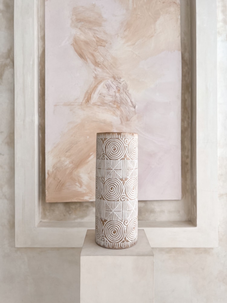Unsere Boho-Vasen haben auf ihrer Oberfläche interessante Muster, die zu 100% von Hand von unserem Lieferanten auf der Insel Bali geschnitzt wurden.