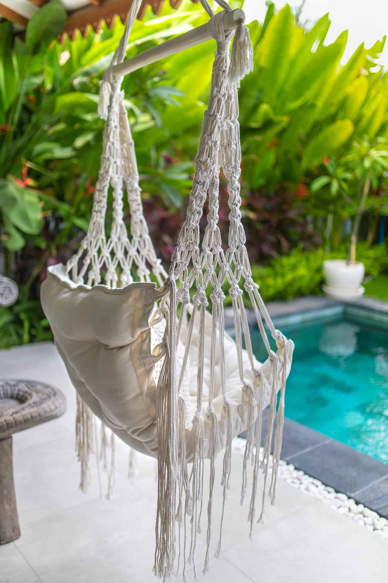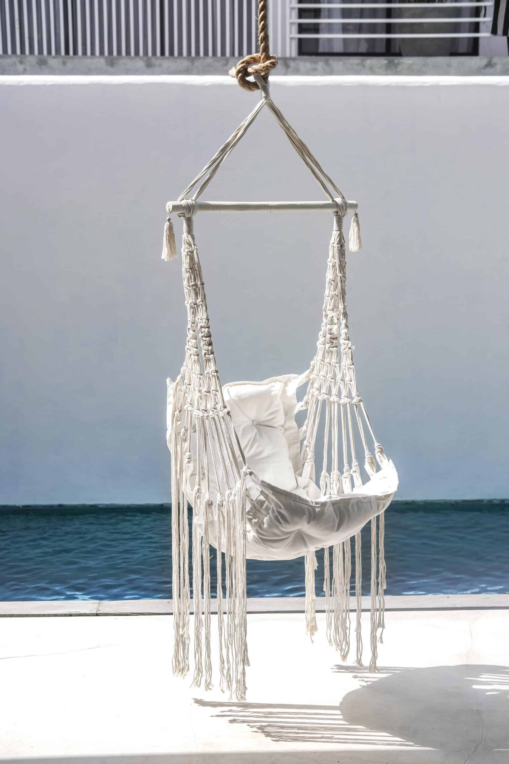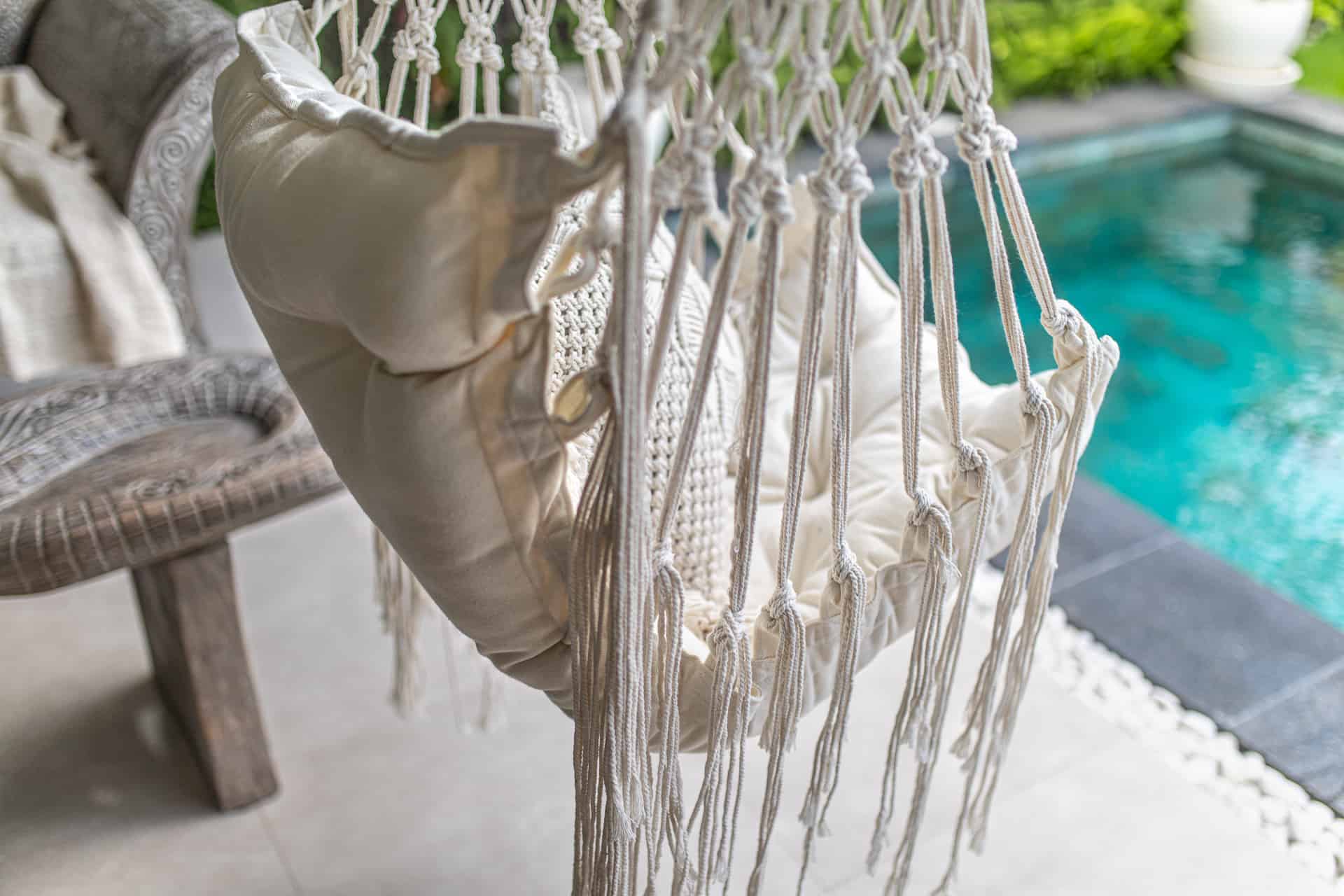 Handgefertigter, hängender Sessel, brasilianische Hängematte im BOHO-Stil, kreiert von den Bewohnern der Insel Bali. In den sorgfältig verwobenen Fasern stecken die Leidenschaft und das Herz von Menschen, die sich seit Generationen mit diesem Handwerk beschäftigen. Perfekt als Gartendekoration, aber auch in Ihrem Wohn- oder Schlafzimmer macht es eine gute Figur.