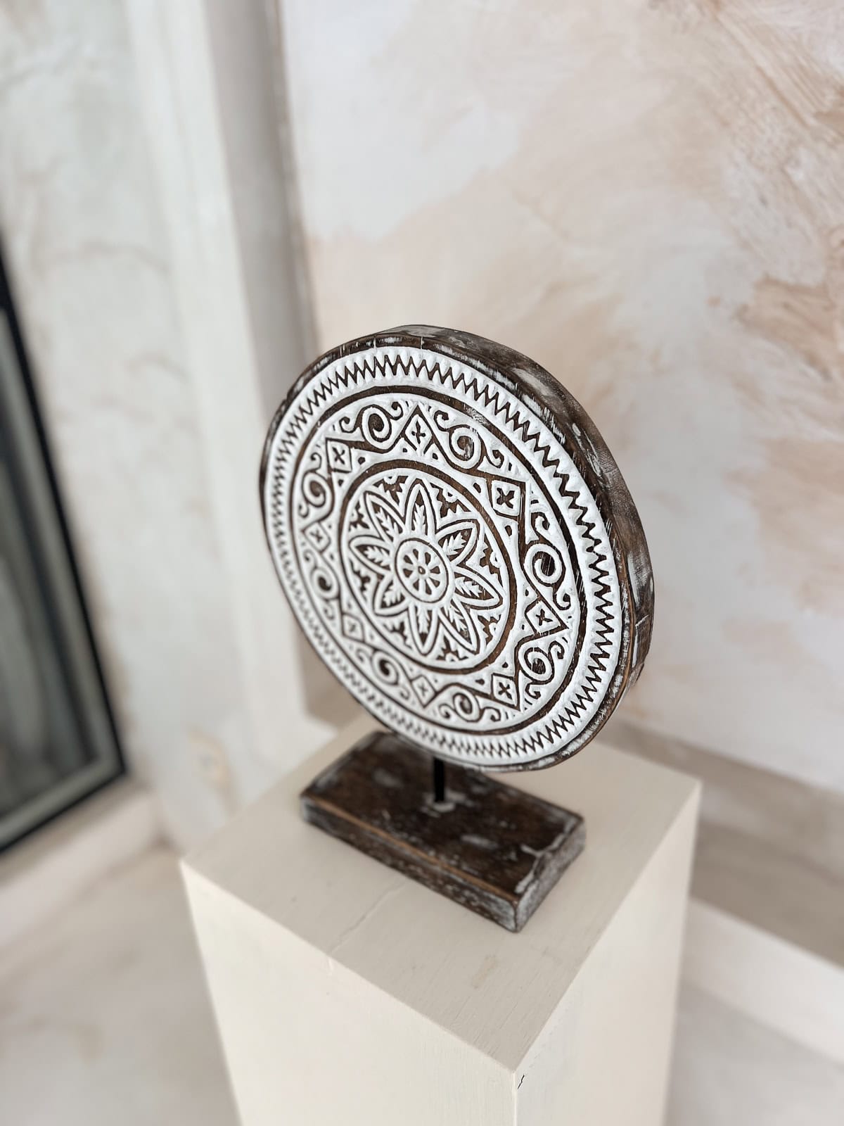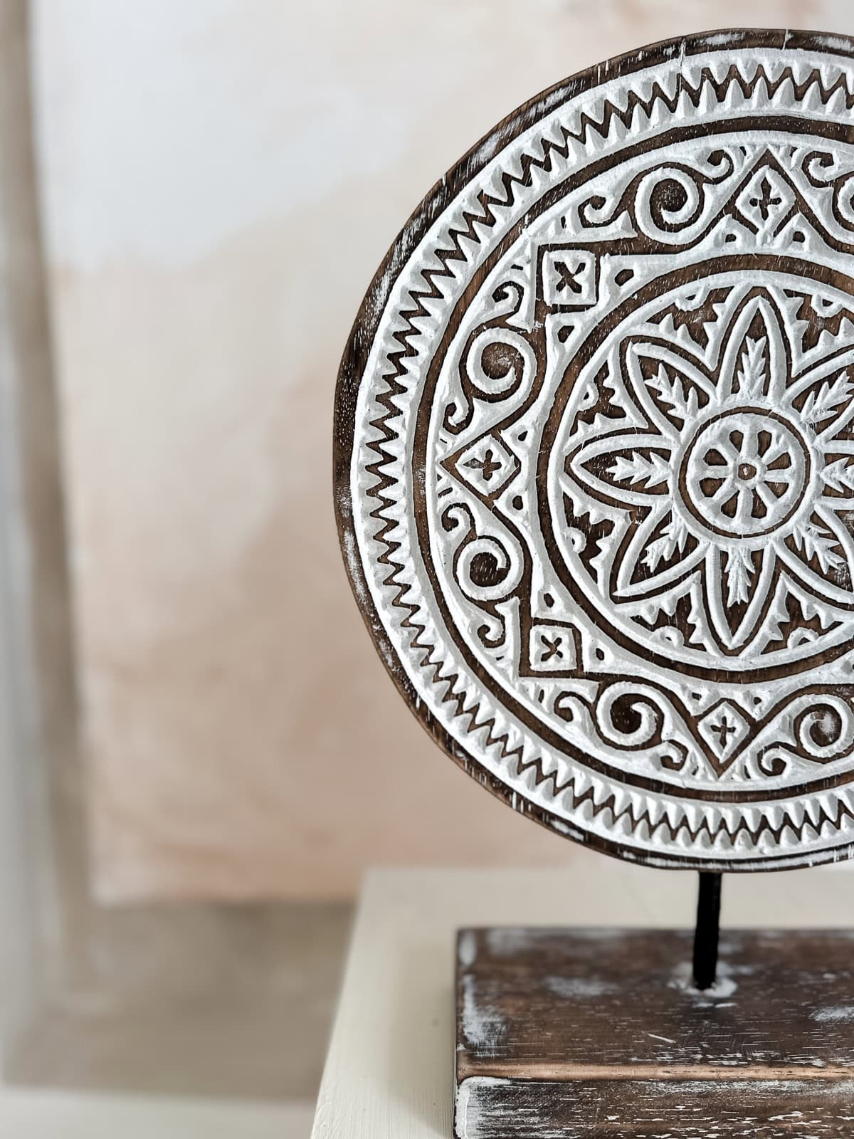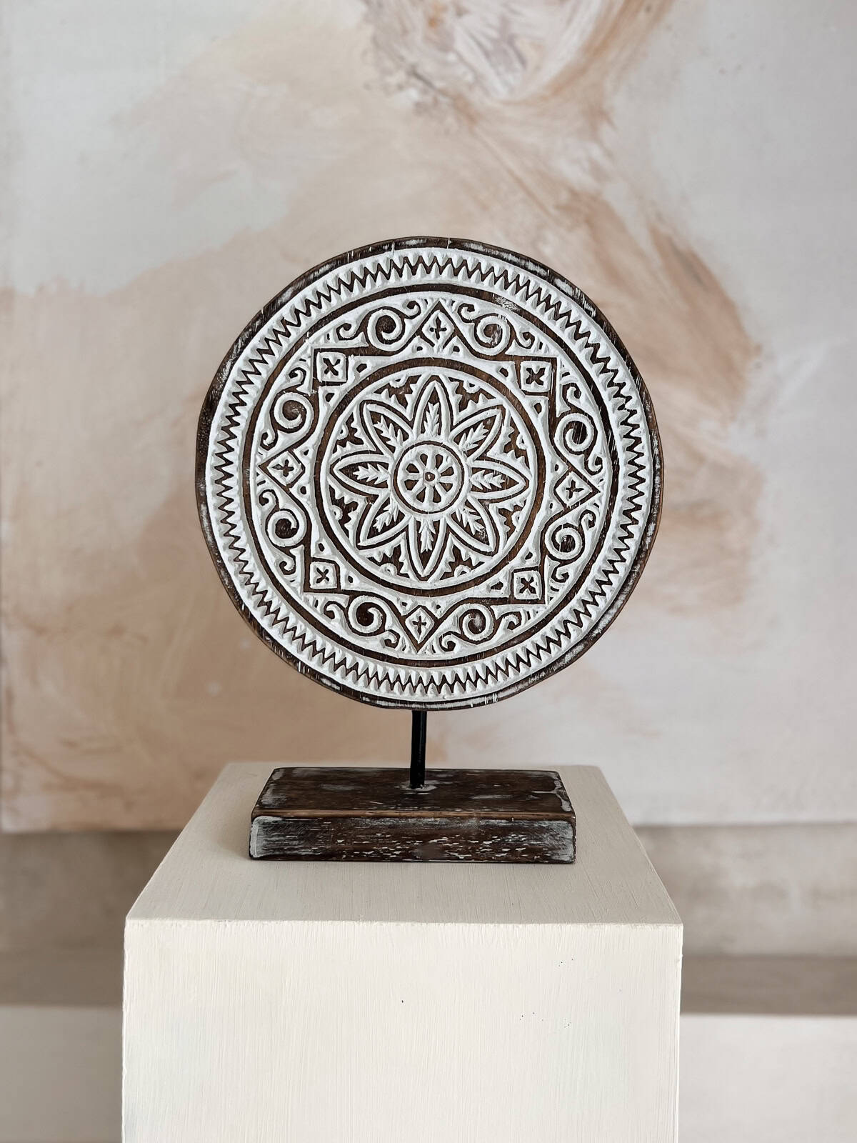 Diese künstlerische Holzdekoration (39 × 29 cm) eignet sich perfekt für Sideboards, Regale oder als Teil einer Ethno-Galerie. Der stabile Metallständer sorgt für modernen Kontrast und einen edlen Look.