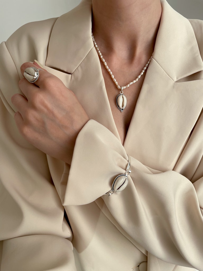 Beschreibung:Kauri-Muschel-Schmuckset: Armband, Ohrringe, Ring und Anhänger
