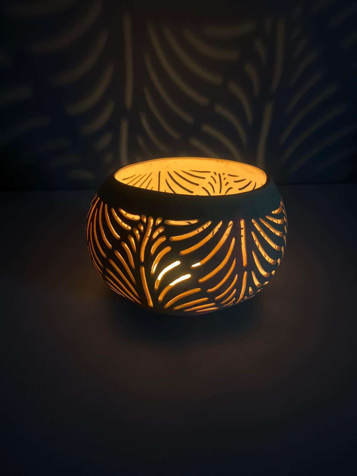 Beschreibung: Kokosnuss Laterne mit Blattmuster