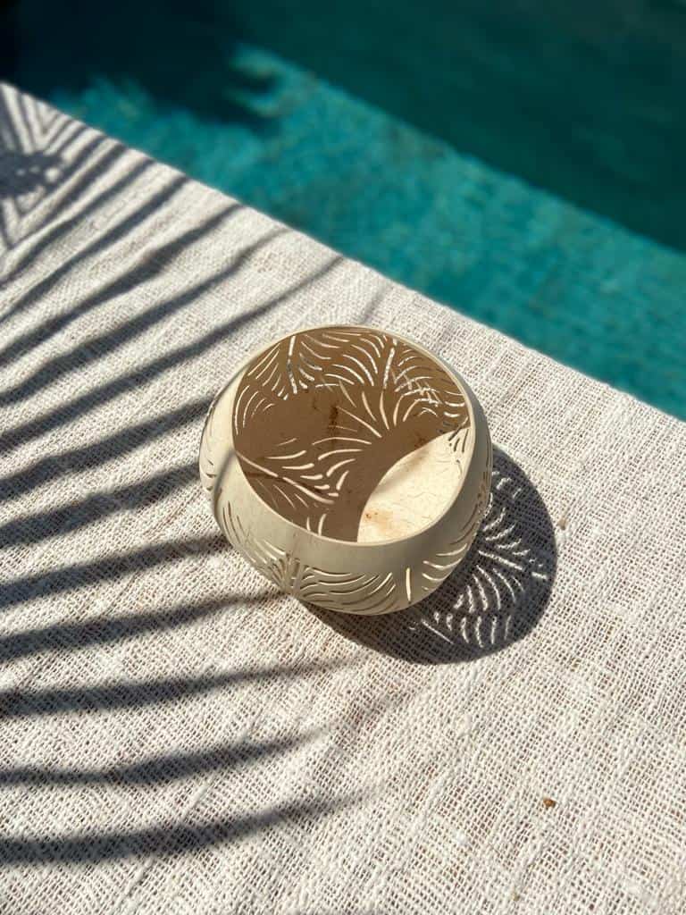 Kokosnuss Laterne BLATT vereint das Beste aus Handarbeit und Natur in einer umweltfreundlichen Dekoration. Jede Laterne ist ein Zeugnis des balinesischen Handwerks, sorgfältig gefertigt mit einem schönen Blattmuster, das nicht nur für atmosphärisches Licht sorgt, sondern auch einen Hauch von Natur in dein Zuhause bringt. Diese Laterne ist die perfekte Wahl für alle, die nachhaltig produzierte, grüne Deko schätzen. Ihr natürliches Beleuchtungselement fügt sich nahtlos in den Boho-Stil ein und verleiht jedem Raum ein warmes, einladendes Flair. Als Bio-Leuchte bietet sie nicht nur ästhetische Schönheit, sondern fördert auch ein bewusstes Leben im Einklang mit der Natur.