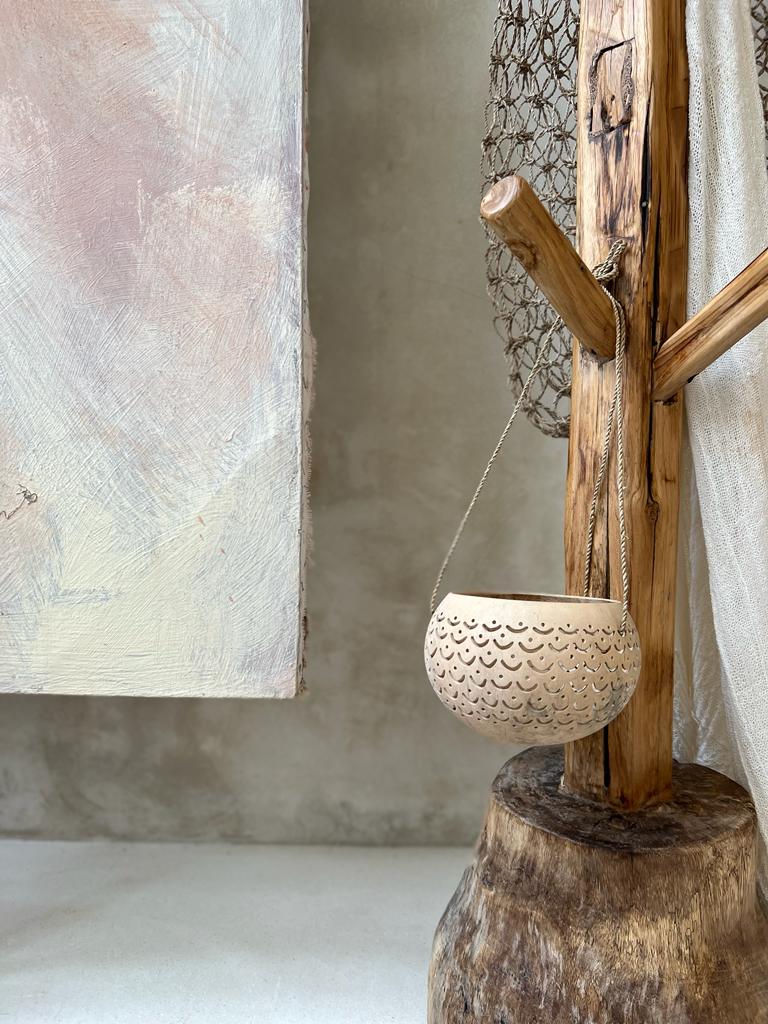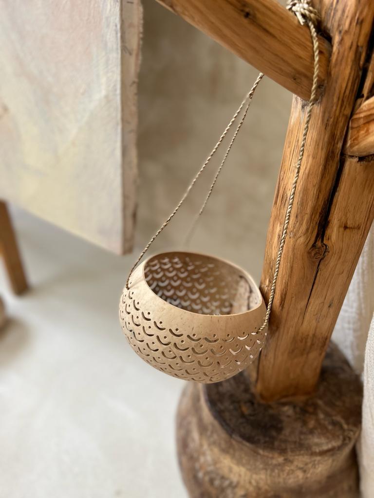 Kokosnuss Laterne ÖSEN reflektiert eine Fusion aus Handwerkskunst und kreativem Design, charakteristisch für den Boho-Stil. Das einzigartige Ösenmuster dieser handgearbeiteten Laterne erzeugt ein faszinierendes Lichtspiel, das jede Umgebung in eine gemütliche und einladende Atmosphäre verwandelt. Gefertigt von balinesischen Kunsthandwerkern, steht diese Laterne nicht nur für originelle Beleuchtung, sondern auch für umweltfreundliche Dekoration. Sie verkörpert den Geist des Bohemian Stils und bringt ein Stück Bali Handwerk direkt in dein Zuhause.