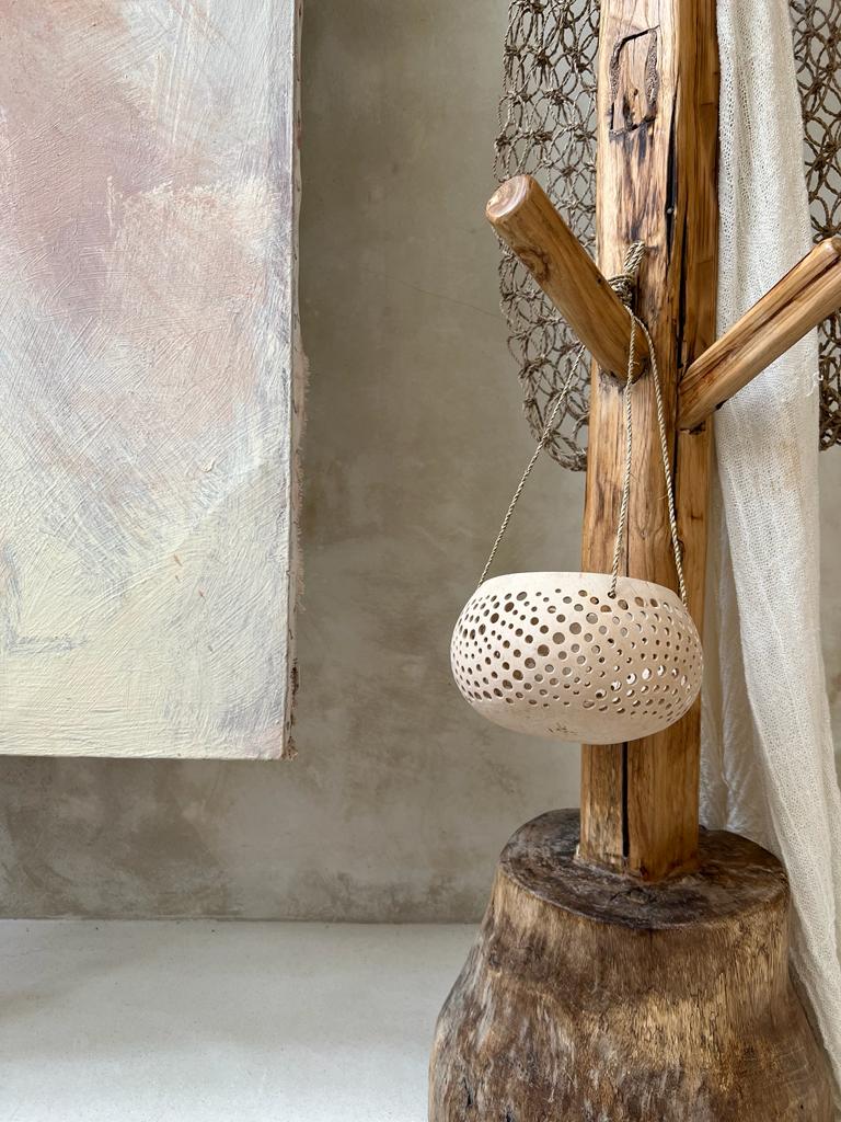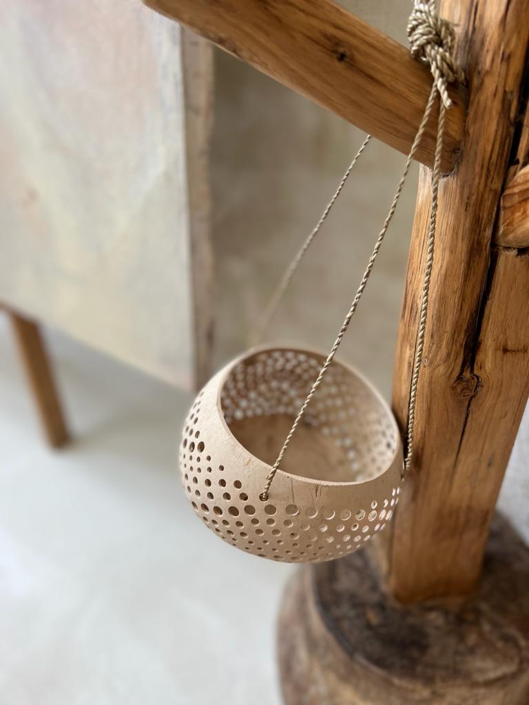 Kokosnuss Laterne PUNKTEN ist ein handgefertigtes Meisterwerk direkt aus Bali. Diese einzigartige Kokosnusslaterne mit Punktmuster bringt einen Hauch von Boho-Stil in dein Zuhause. Perfekt als Deko-Licht, vereint sie natürliche Materialien mit kunstvollem Design. Jede Laterne ist ein Beweis für das balinesische Kunsthandwerk und fügt sich nahtlos sowohl in Innenräume als auch in Außendekorationen ein. Dank der Verwendung von natürlichen Materialien ist jede Laterne nicht nur ein Lichtspender, sondern auch eine umweltfreundliche Deko, die Wärme und rustikalen Charme ausstrahlt.