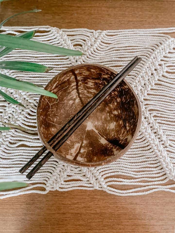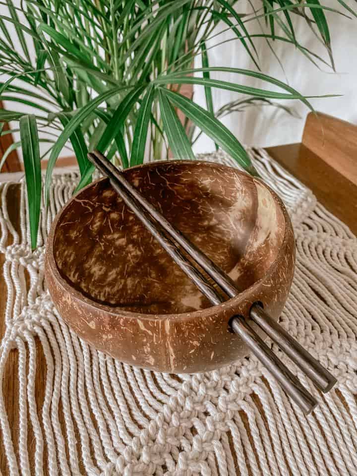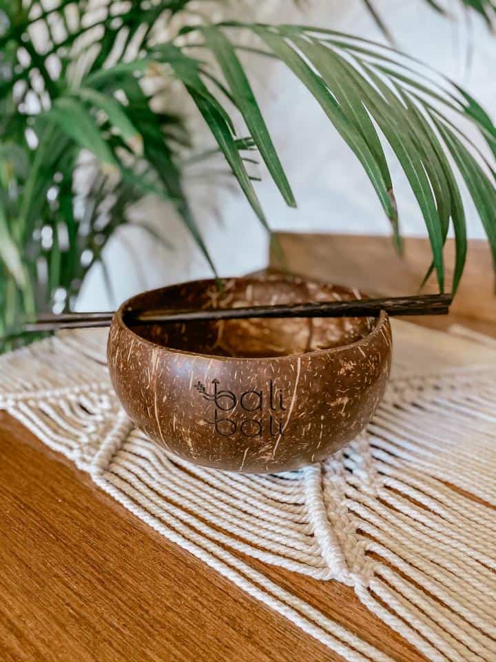 Schüssel aus 100 % natürlicher Kokosnussschale mit Kokosnuss-Essstäbchen. Die Kokosnussschale hat hohle Löcher, in die Sie Essstäbchen stecken können, sodass die Gerichte, die Sie darin servieren, sehr eindrucksvoll aussehen. Hergestellt von unserem Lieferanten in Ubud, Bali, wobei nur die besten Kokosnüsse ausgewählt werden, aus denen nach dem Mahlen diese natürlichen Produkte entstehen.