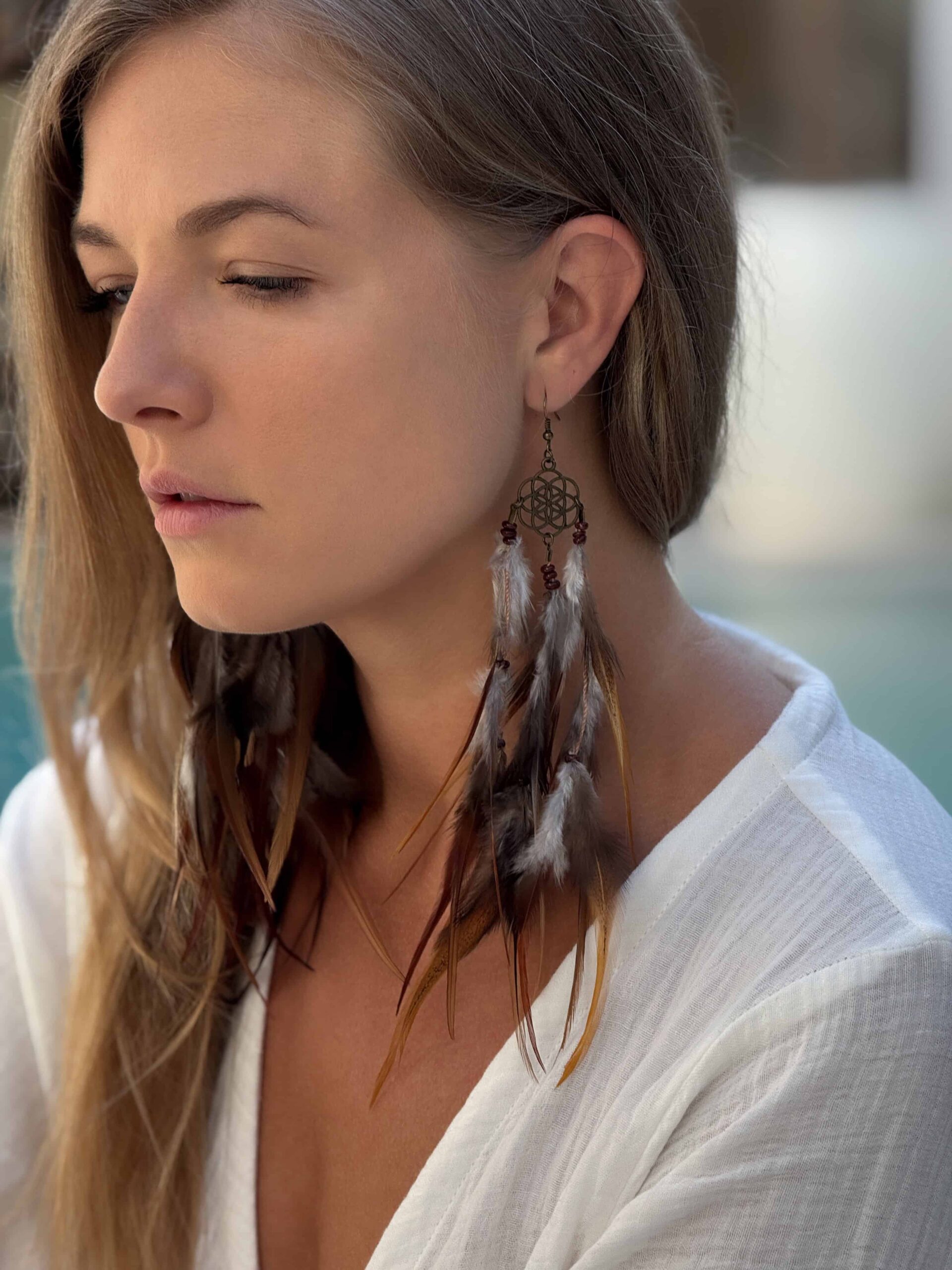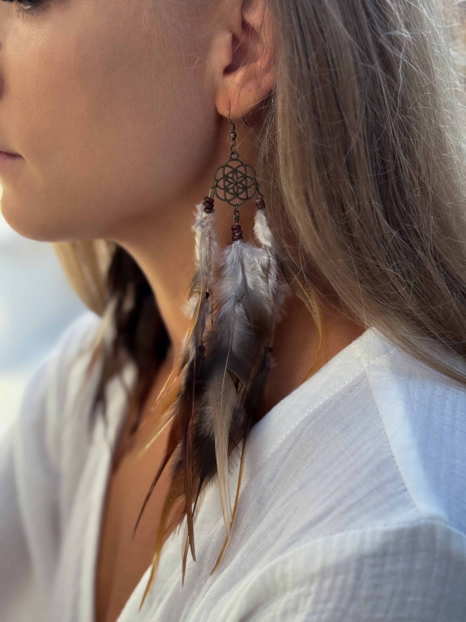 Beschreibung: Exklusive, handgefertigte Federohrringe im Boho Stil, ideal für Damen, die Natürlichkeit und Individualität lieben.