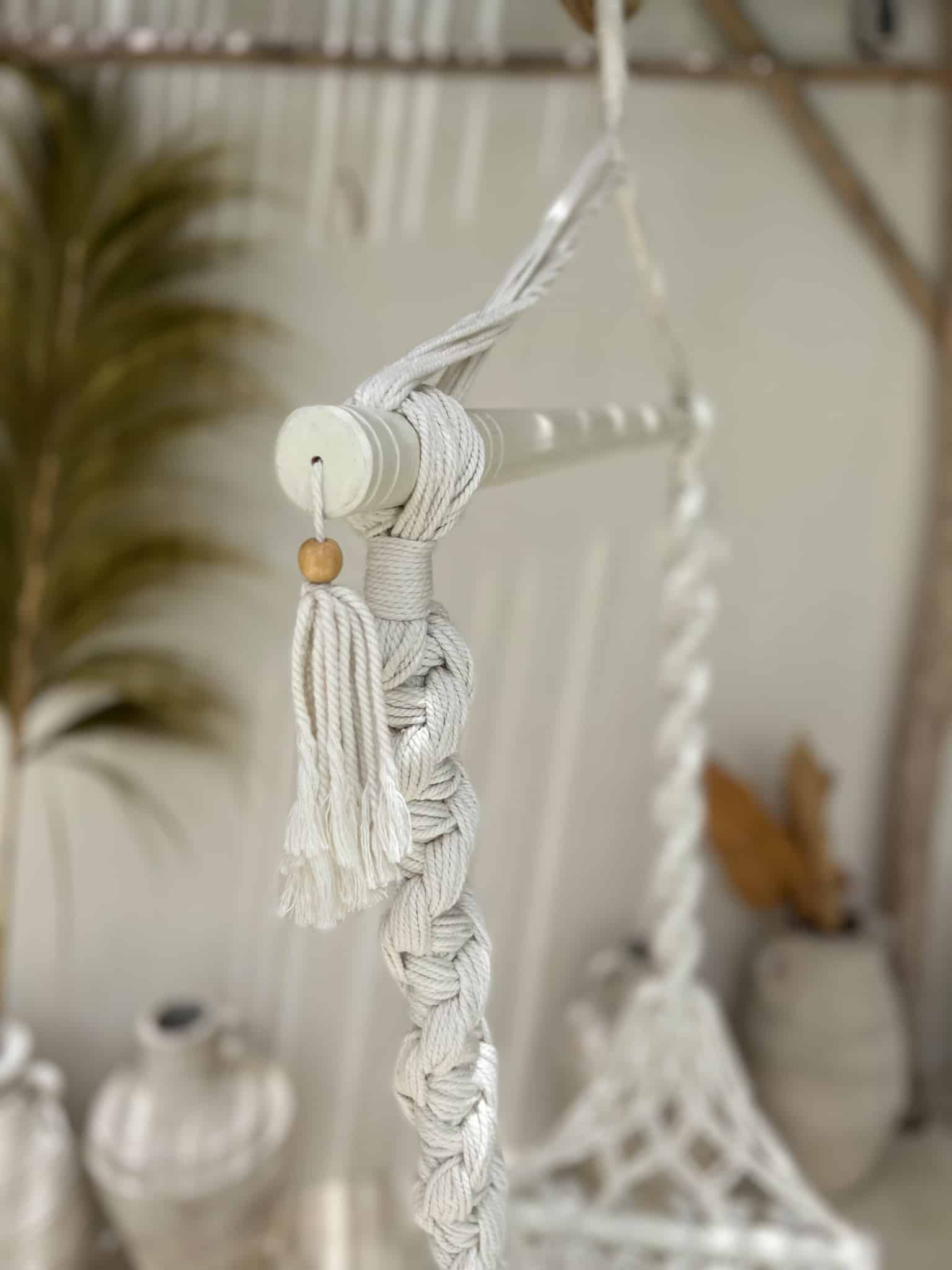 DieBoho-Schaukel besteht aus natürlichen Materialien wie Baumwolle und Holz, was ihr einen rustikalen Charme verleiht. Es wird in der Makramee-Technik gewebt, bei der die Fäden geflochten und zu dekorativen Mustern verwoben werden, was ihm einen einzigartigen Stil und eine einzigartige Ästhetik verleiht.