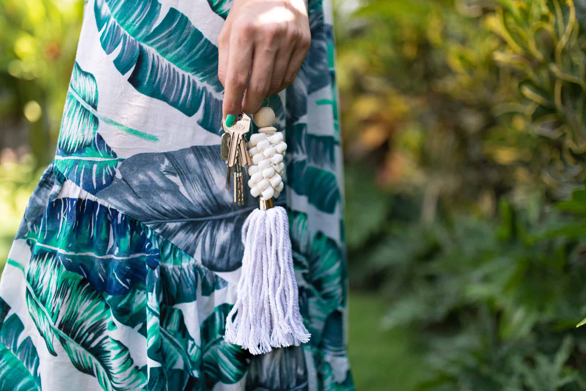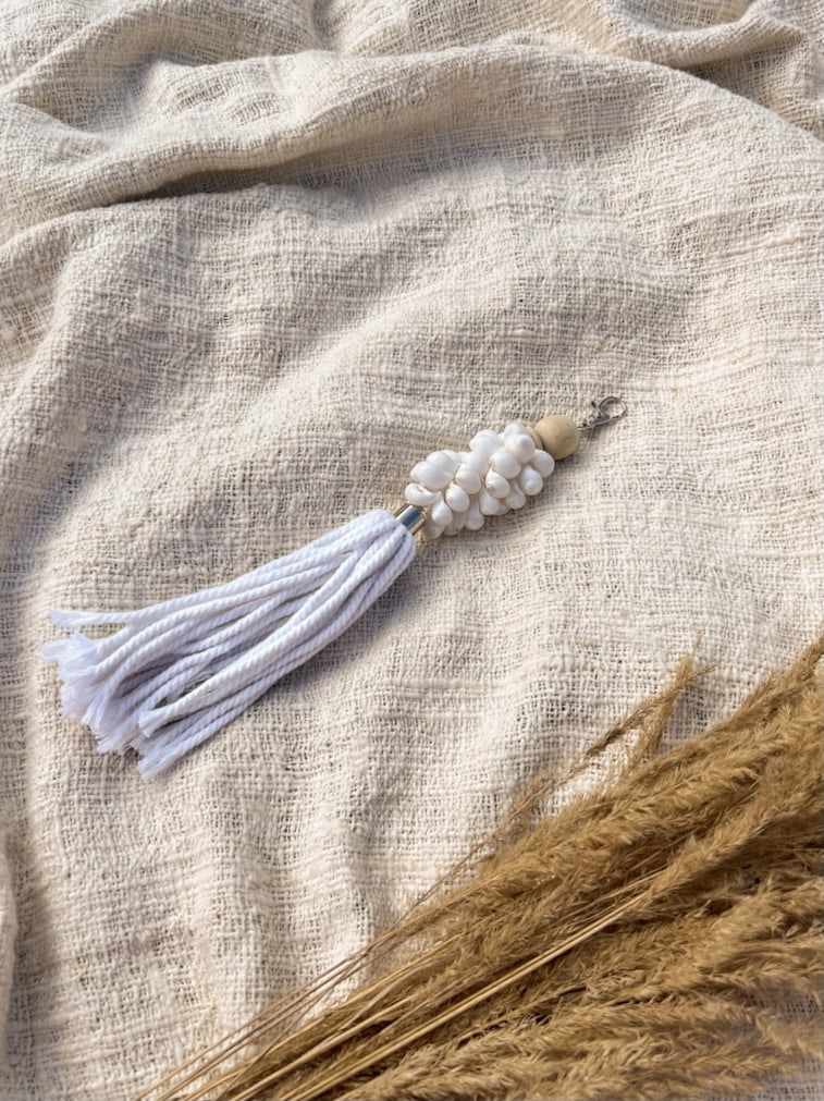 Weißer handgefertigter Schlüsselanhänger aus natürlichen Muscheln. Es kann auch als stilvoller Taschenanhänger verwendet werden. Wenn Sie Schwierigkeiten haben, Ihre Schlüssel zu Hause zu finden, hören Sie einfach zu und das Rauschen des in Muscheln eingeschlossenen balinesischen Ozeans verrät Ihnen, wo sich Ihr verlorener Gegenstand befindet. Auch in der DARK-Version erhältlich.