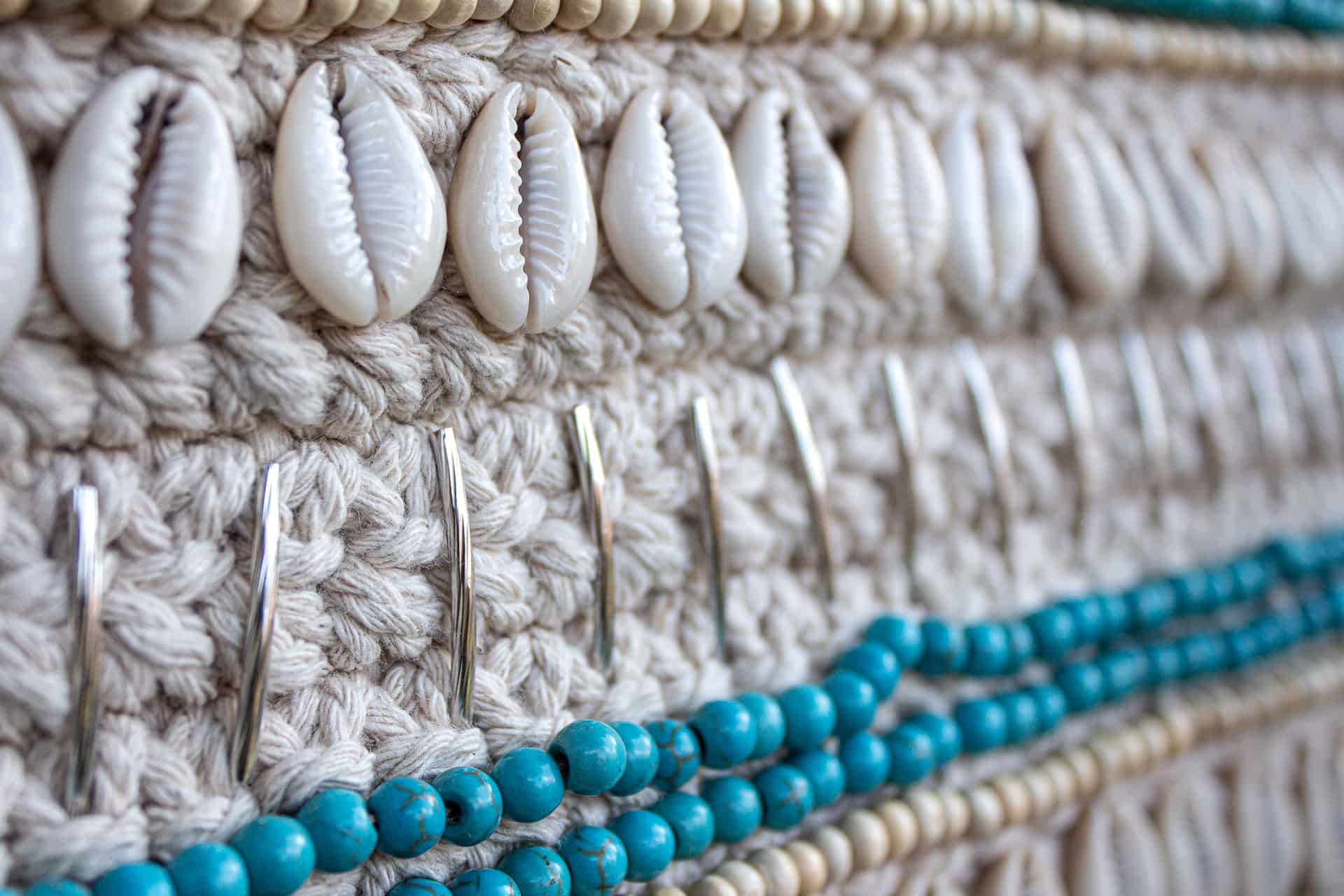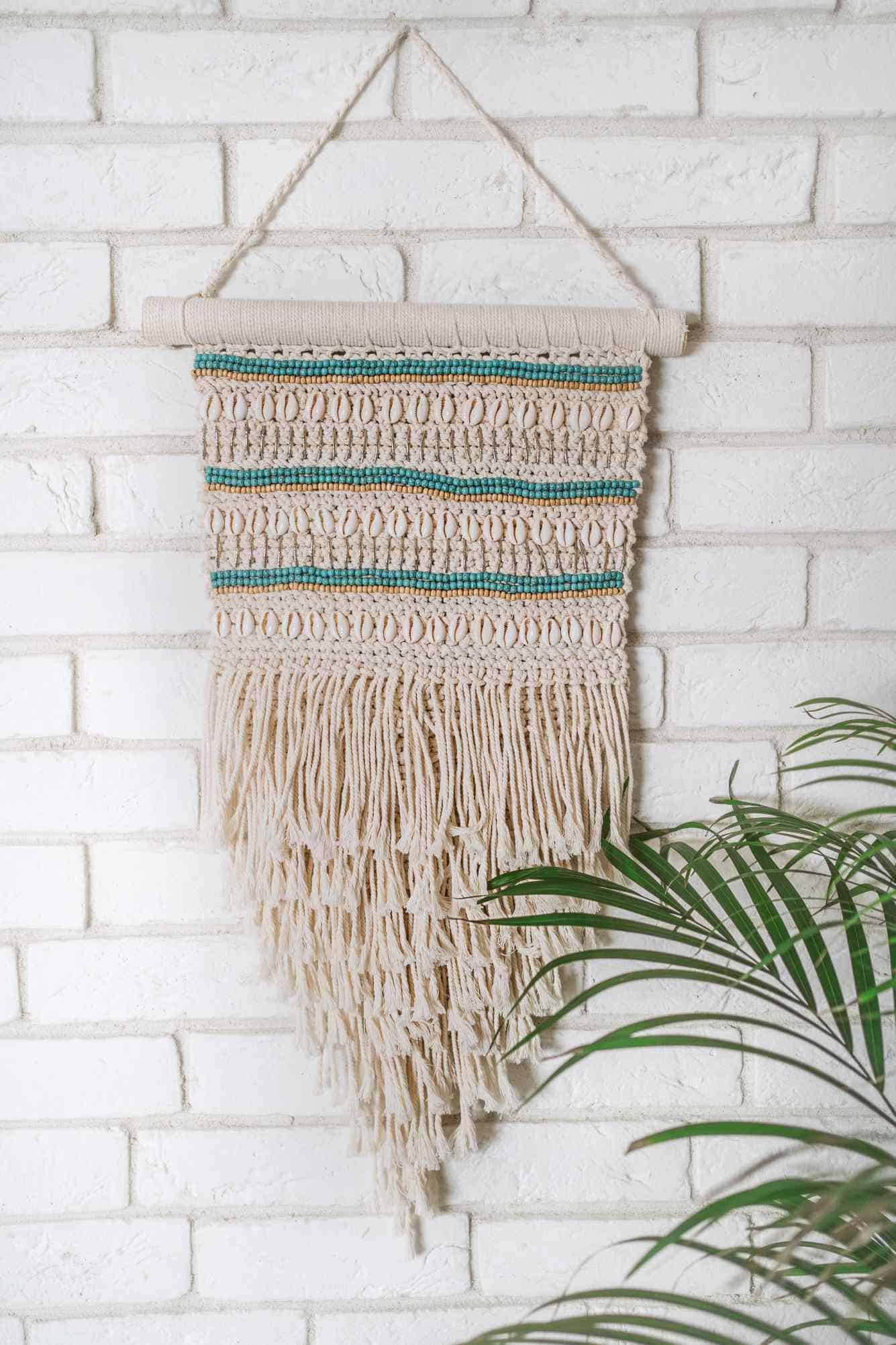 Handgefertigter Makramee-Wandbehang mit Muscheln. Das Produkt wurde von unserem Lieferanten aus Tabanan, Bali, Faser für Faser aus Baumwolle gewebt. Makramee ist eine alte Kunst, Schnüre von Hand zu binden, ohne eine Häkelnadel zu verwenden. Auf diese Weise entstand diese eindrucksvolle Dekoration.