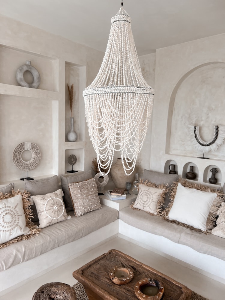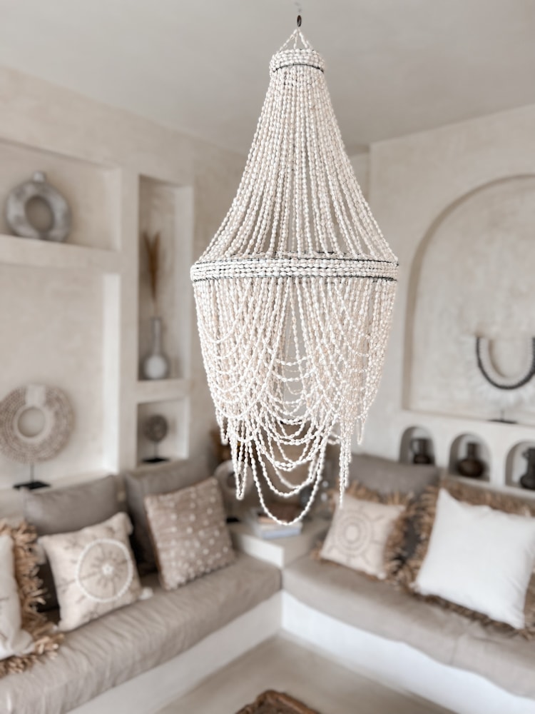 Muschel-Kronleuchter Weiß ELSA – Der ELSA Muschelleuchter vereint luxuriöse Muschelbeleuchtung mit einem rein weißen Design in handgefertigter Perfektion. Nutzen Sie ökologische Materialien, um Ihr Interieur stilvoll zu erleuchten und eine Atmosphäre von Boho Chic zu schaffen. Mit einer Gesamtlänge von 90 cm und einem Durchmesser von 40 cm bringt ELSA elegantes Licht und einen Hauch von Meer in jedes Zuhause.