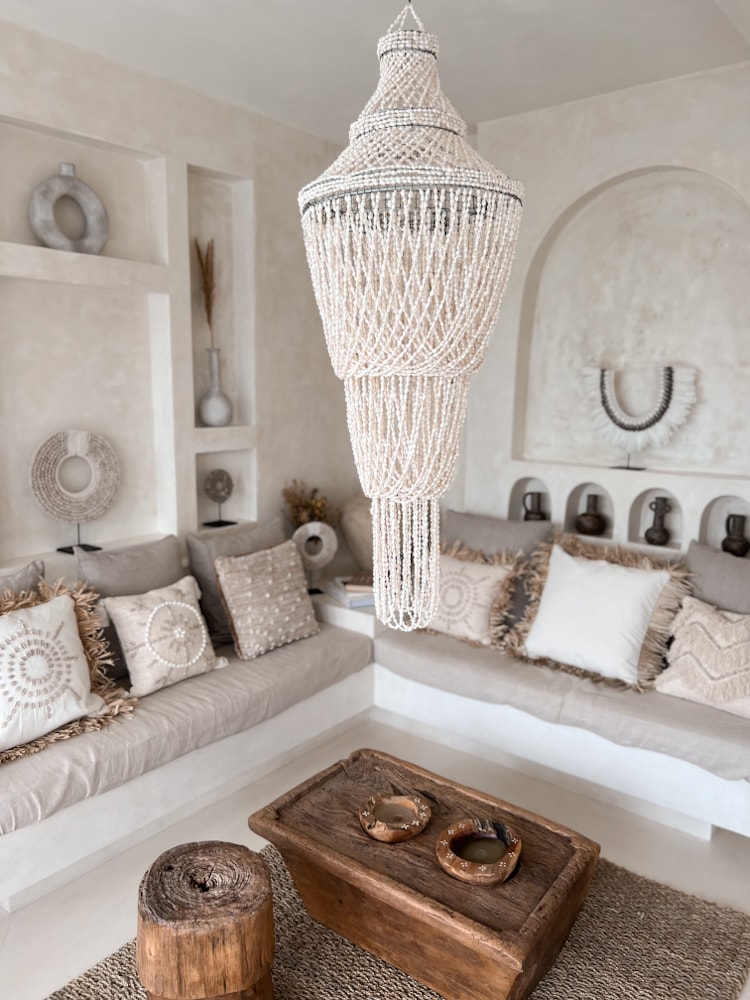 Muschel-Kronleuchter Weiß MILA – Der MILA Muschelkronleuchter bringt mit seiner natürlichen Muscheldeko und weißen Meeresbeleuchtung Eleganz und Bohemian Stil in Ihr Zuhause. Als nachhaltiges Produkt und elegante Lampe ist MILA eine Quelle für kreative Raumgestaltung, die natürliche Schönheit mit handwerklicher Kunst vereint. Mit einer Gesamtlänge von 125 cm und einem Durchmesser von 40 cm, setzt dieser Kronleuchter einzigartige Akzente in jedem Raum.
