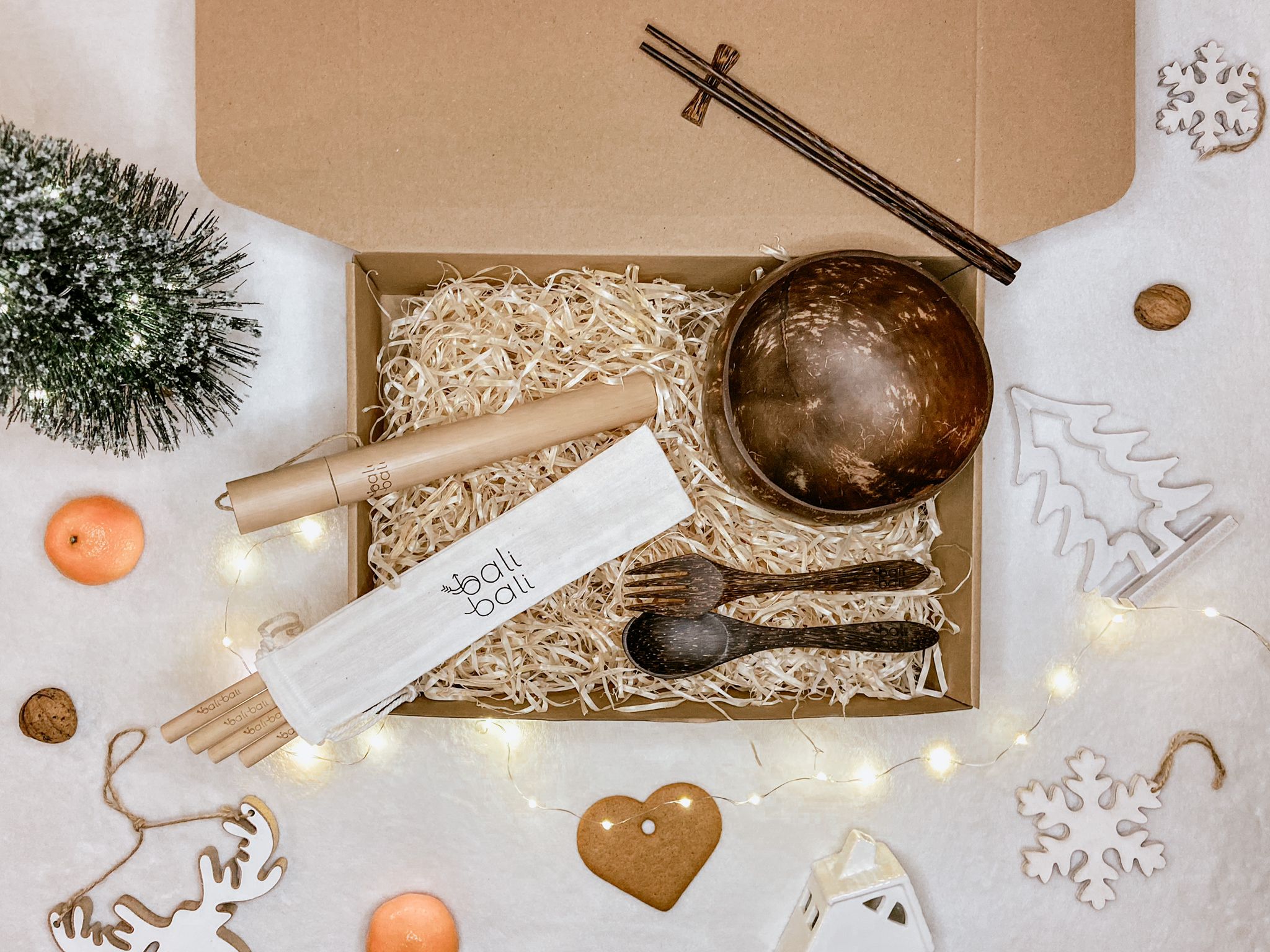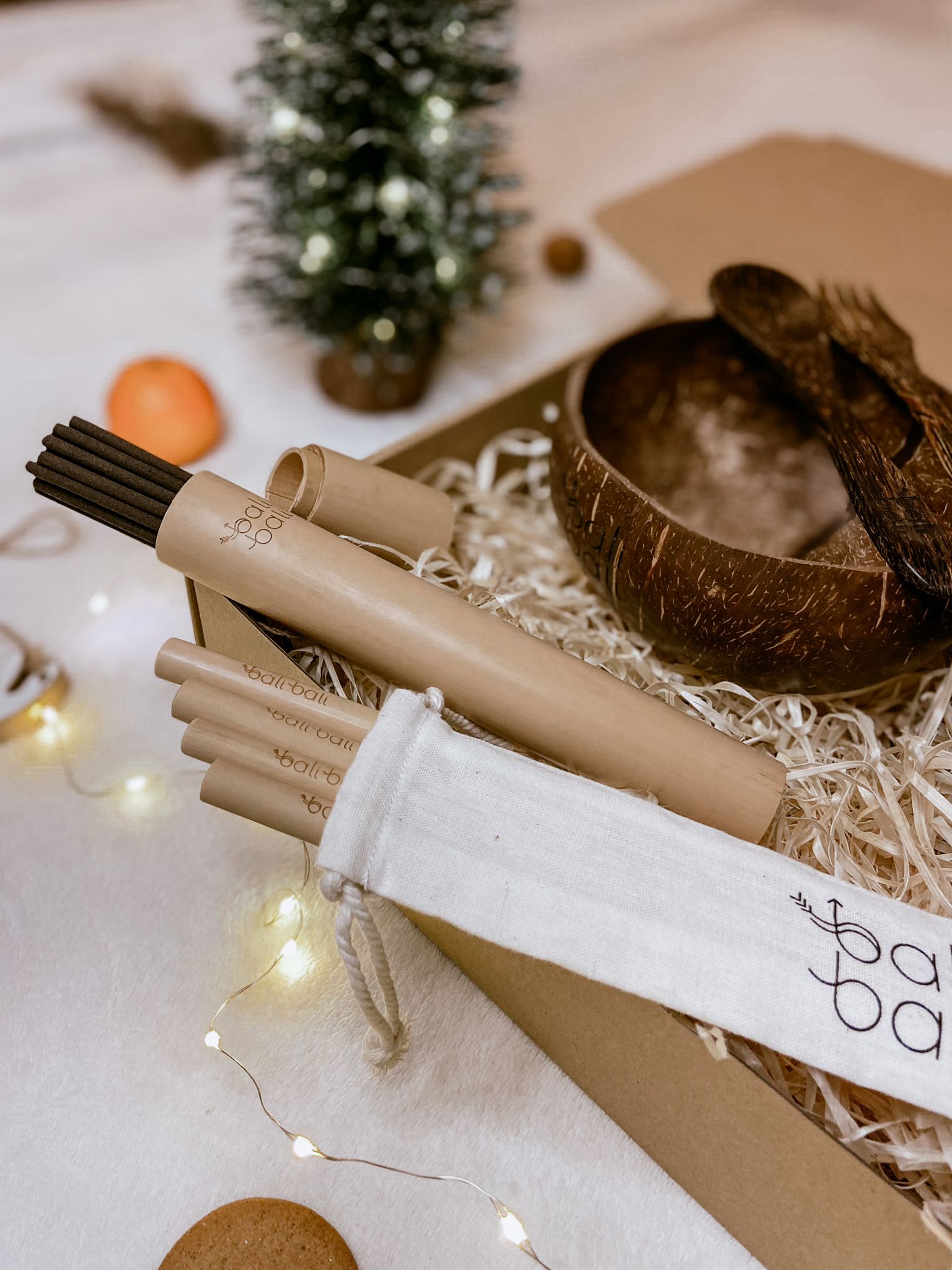 Öko-Geschenk ist die perfekte Geschenkidee für Ihre Lieben. Unser Öko-Set wurde auf Bali handgefertigt, ausschließlich aus natürlichen Materialien. Ekogift umfasst eine natürliche Schüssel aus Kokosnussschale und ökologisches Besteck aus Kokosnussholz (Löffel, Gabel und Essstäbchen mit Ständer). Darüber hinaus enthält das Set vier vollständig ökologische Bambusstrohhalme im Etui mit Reiniger und handgefertigte Räucherstäbchen in einer Bambusverpackung.