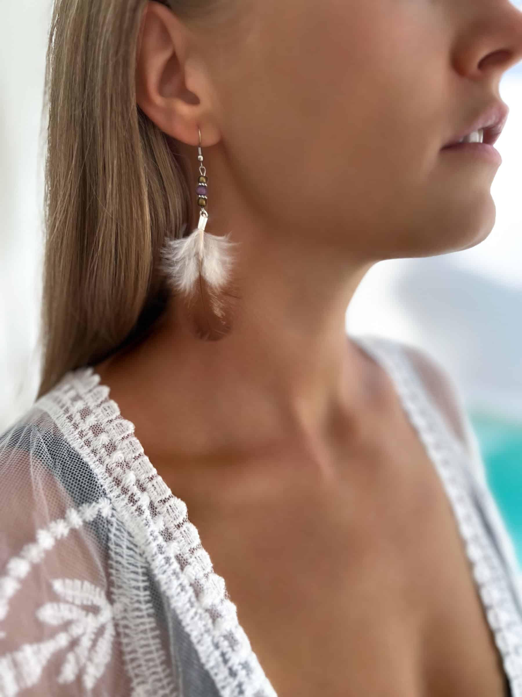 Ohrringe mit braunen Federn Boho NEL – Diese handgefertigten Ohrringe aus Bali mit braunen Federn verkörpern einen natürlichen Boho-Stil. Sie sind ideal für alle, die Erdtöne und natürliche Materialien schätzen. Diese Ohrringe fügen sich nahtlos in sowohl lässige als auch elegantere Outfits ein und bieten eine charmante Ergänzung zu jedem Look. Ihre Leichtigkeit macht sie zu einem perfekten Accessoire für den ganzen Tag.
