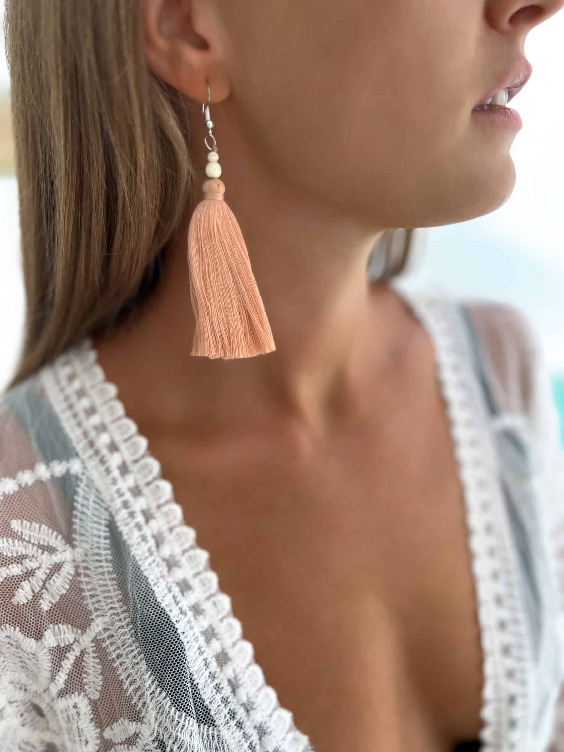 Quasten Ohrringe Boho KAMI BEIGE – Diese eleganten, handgefertigten Ohrringe aus Bali mit beigen Quasten verkörpern einen anspruchsvollen Boho-Stil. Sie sind ideal für alle, die ein subtiles, aber dennoch auffälliges Accessoire suchen. Die sanften Beigetöne und die feinen Quasten verleihen jedem Outfit eine zarte Eleganz, perfekt für den Alltag oder besondere Anlässe.