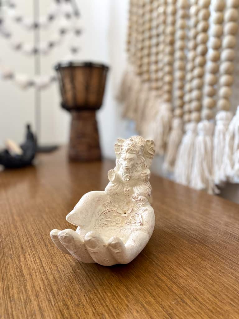 Räucherstäbchenhalter GANESHA Weiß vereint balinesisches Kunsthandwerk mit spiritueller Bedeutung in einem handgefertigten Unikat. Dieses öko-freundliche Stück mit einem GANESHA Weiß Design ist nicht nur eine Hommage an die hinduistische Symbolik, sondern schafft auch eine segensreiche Atmosphäre in deinem Zuhause. Ideal für die spirituelle Praxis oder als inspirierende Ergänzung deiner Wohnkultur. Die göttliche Präsenz Ganeshas fördert nicht nur die Spiritualität, sondern dient auch als stilvolles, spirituelles Dekorationselement.