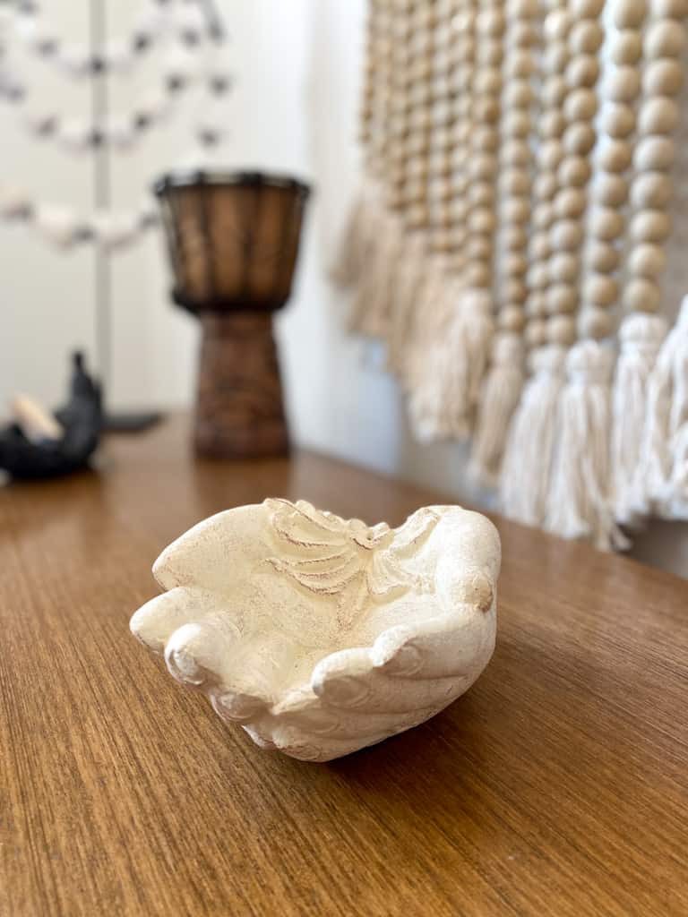 Räucherstäbchenhalter Hände Weiß ist ein in Bali handgefertigtes Kunstobjekt, das die Schönheit des traditionellen Kunsthandwerks mit einem zeitgenössischen Boho-Dekor verbindet. Dieses ökologisch nachhaltige Unikat, gefertigt aus Naturmaterialien, präsentiert sich im einzigartigen Hände Weiß Design. Es symbolisiert Einheit und Harmonie und ist eine wunderbare Ergänzung für ein friedvolles, harmonisches Zuhause. Neben seiner Funktion als Räucherstäbchenhalter dient es auch als bedeutungsvolle Dekoration oder als besondere Geschenkidee für jemanden, der das Symbolische und Einzigartige schätzt.
