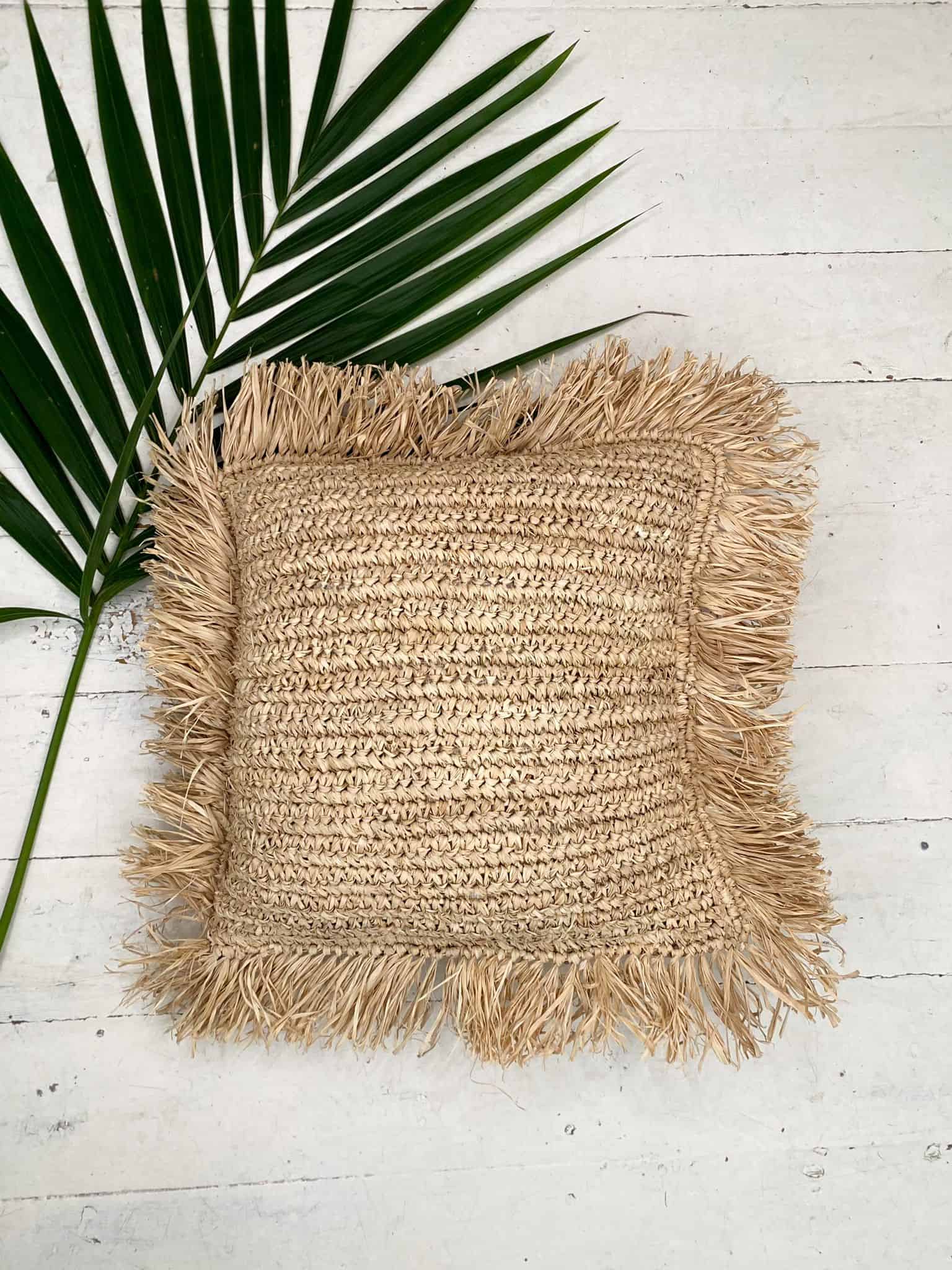 Raffia-Kissenbezug L (60cm x 60cm + Fransen) – Verschönere Dein Zuhause mit unserem handgefertigten Raffia-Kissenbezug L, der natürliche Eleganz und Boho-Chic verbindet. Dieses Wohnaccessoire, hergestellt aus natürlicher Raffia und kunstvoll verarbeitet von balinesischen Handwerkern, bietet eine ökologische Ergänzung zu Deiner Einrichtung. Ideal für alle, die Wert auf stilvolle Raumgestaltung und Nachhaltigkeit legen, bringt dieses Kissen ein Stück Bali-Kunsthandwerk direkt in Dein Wohnzimmer.