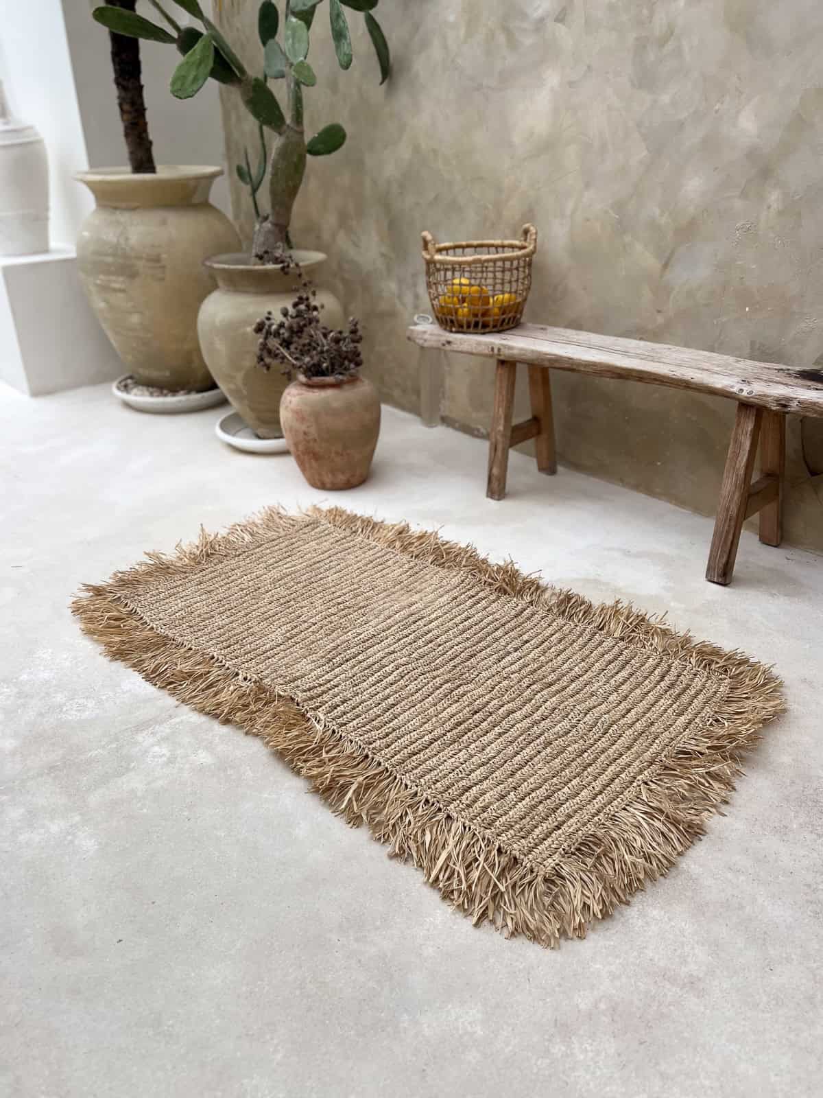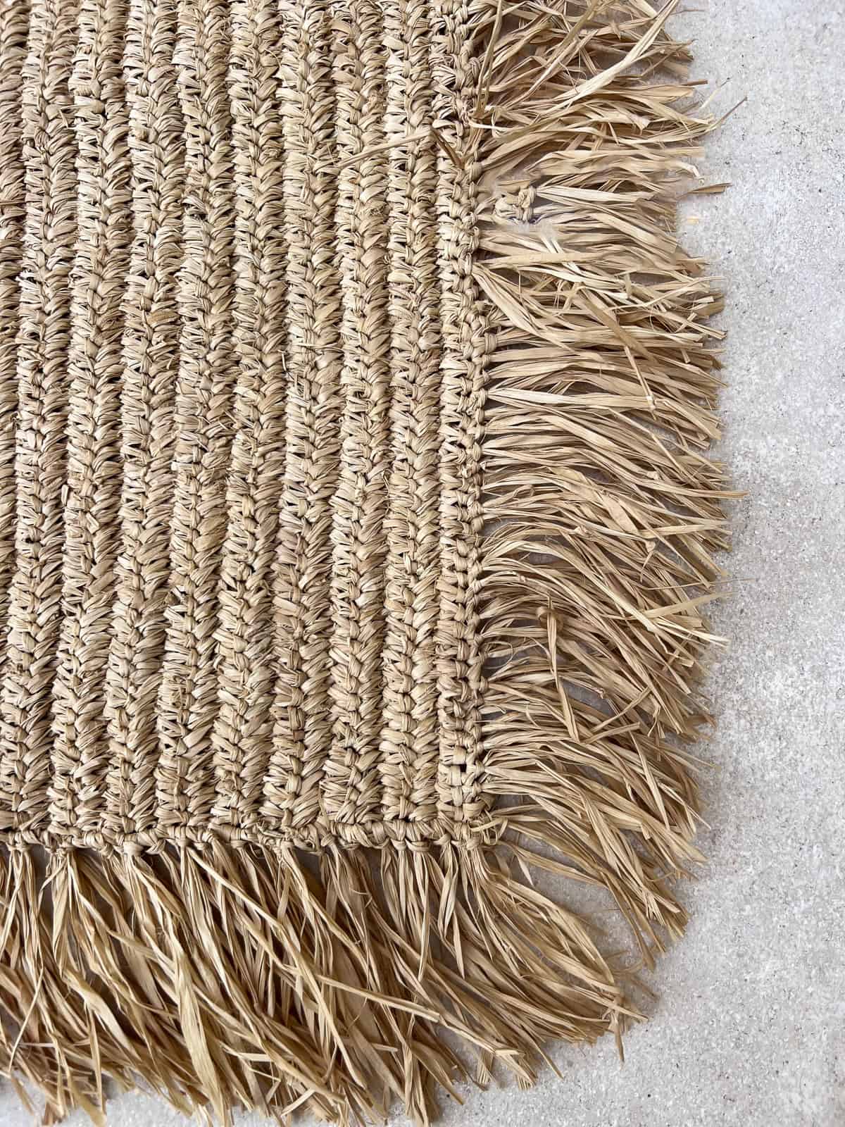 Die feinen Fransen an den Rändern unseres Strohteppichs verleihen ihm dezent Charakter und machen ihn voluminös und lebendig. Ein solcher Raffia-Teppich passt wunderbar nicht nur ins Wohnzimmer, sondern auch als Boho-Teppich fürs Schlafzimmer, wo er Leichtigkeit, Natürlichkeit und Stil verleiht.