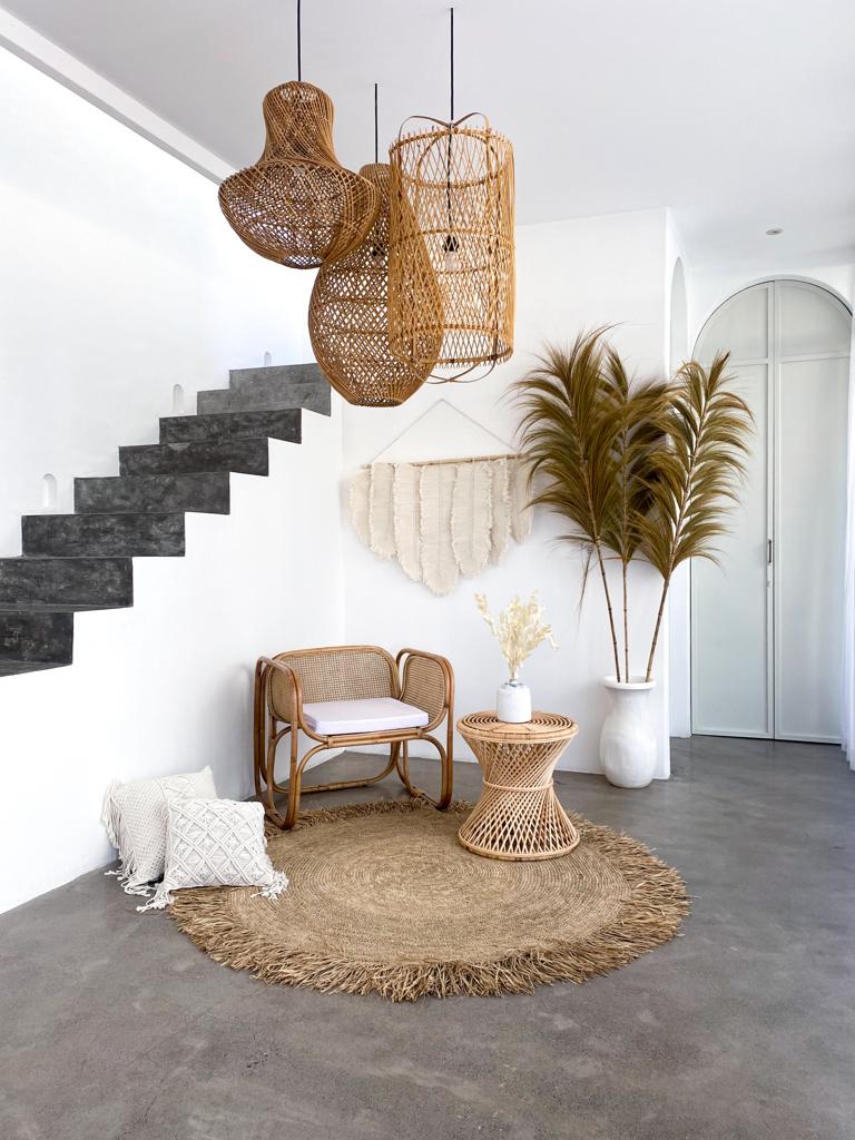 Der Raffiateppich ist handgeflochten auf Bali und zeichnet sich durch seine runde Form aus. Dieser Teppich fügt sich nahtlos in den Boho-Stil ein und bringt eine natürliche, erdige Ästhetik in jeden Raum. Seine handwerkliche Herstellung garantiert ein einzigartiges Produkt von hoher Qualität, das sowohl traditionelles Kunsthandwerk als auch zeitgemäßes Design widerspiegelt. Ideal für diejenigen, die ihr Zuhause mit authentischen, handgemachten Elementen bereichern möchten.
