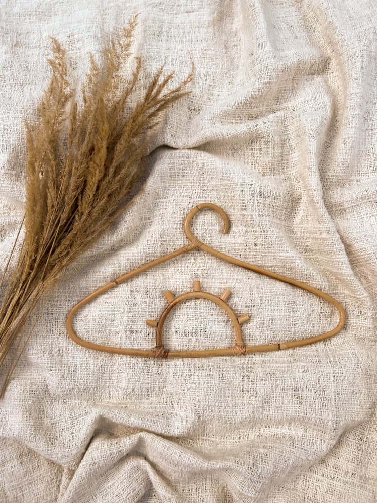 Dekorativer Rattan-Kleiderbügel ist ein interessantes Element, das Sie in einem Schlaf- oder Kinderzimmer platzieren können.