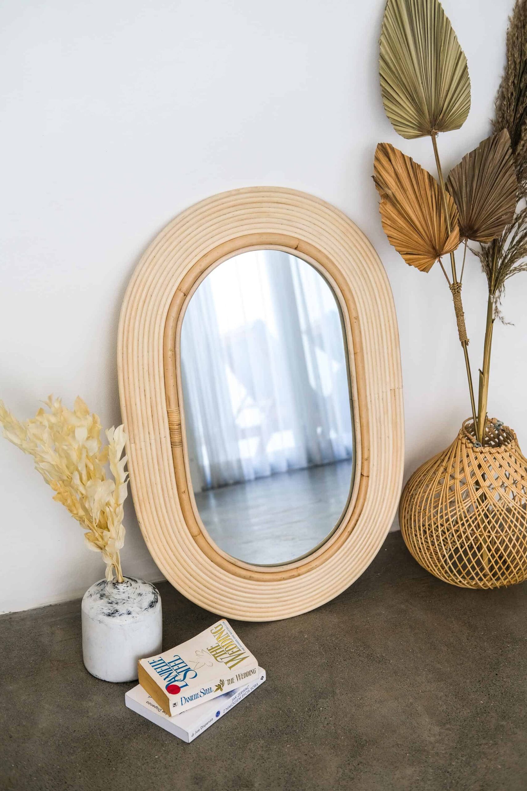 Rattan Spiegel OVAL – Ein Meisterwerk der Handarbeit: Der ovale Rattanspiegel vereint Bohemian Dekor mit rustikaler Eleganz. Dieses handgefertigte Stück ist eine Hommage an natürliche Materialien und schlichtes Design, ideal für jeden, der seinem Raum eine warme, einladende Atmosphäre verleihen möchte. Der Spiegel fügt sich perfekt in eine Vielzahl von Einrichtungsstilen ein und verleiht jedem Raum Tiefe und Charakter.