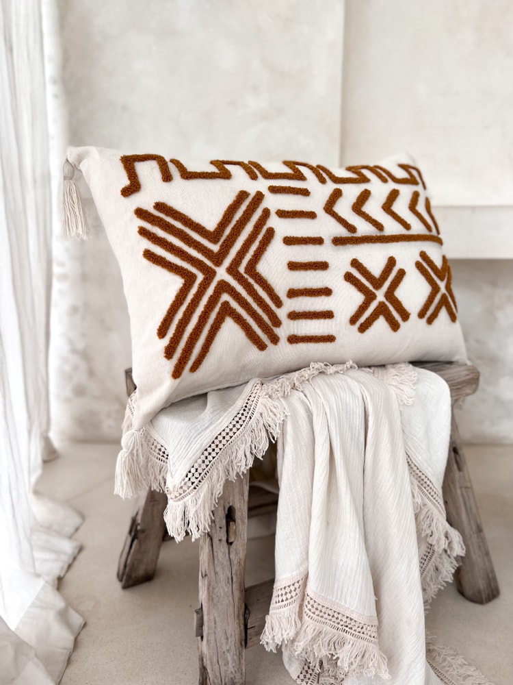 Rechteckige Boho-Kissenbezug LINDA (60cm x 40cm + Fransen) – Der LINDA Boho Kissen bringt handgemachte Eleganz und eine reiche Bohemian Wohnkultur in Dein Zuhause. Diese rechteckige Kissenhülle, sorgfältig gefertigt aus nachhaltigen Heimtextilien und ökologischen Produkten Balis, ist ein Ausdruck von Stil und Umweltbewusstsein. LINDA ist perfekt für alle, die ihr Zuhause mit stilvollen, nachhaltigen und authentischen Bali Produkten verschönern möchten.