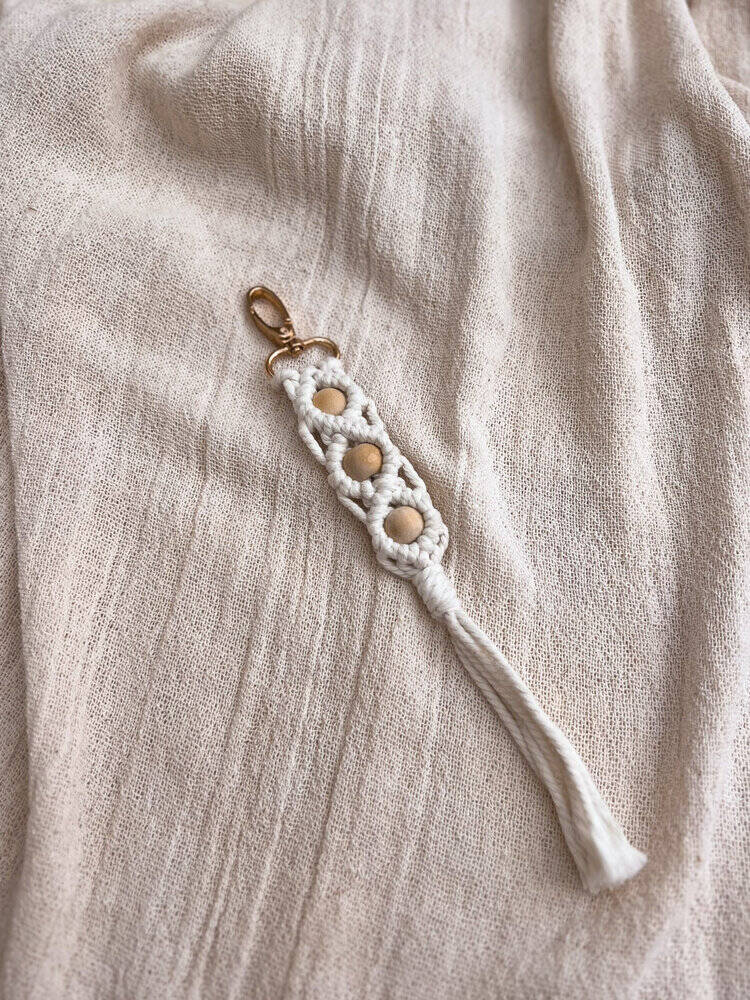 Die Holzperlen verleihen dem Design einen sanften, rustikalen Akzent und harmonieren wunderbar mit dem natürlichen Baumwollgarn. Ob als Schlüsselanhänger, Dekoration für Rucksack oder Tasche – dieses kleine Accessoire sorgt für eine warme, handgemachte Note in deinem Alltag.