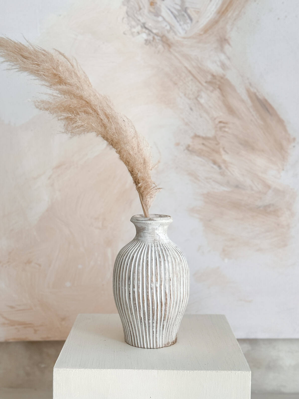 Mit 25 × 20 cm eignet sich diese Holzvase perfekt als Centerpiece auf Esstisch, Konsole oder Sideboard. Bestückt mit Trockenblumen oder Gräsern – oder ganz pur – wirkt sie gleichermaßen.