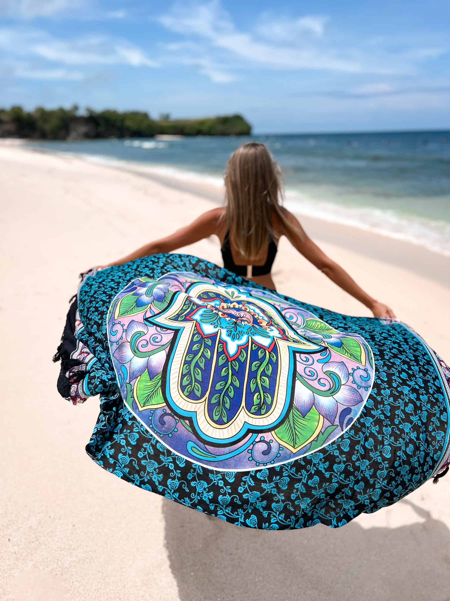 Strand Pareo Sarong FATIMA Blau ist ein handgefertigtes Produkt von der Insel Bali. Dieses elegante Strandpareo im Boho-Stil passt perfekt zu sommerlichen Outfits und verleiht deinem Strandlook das gewisse Etwas. Es ist aus weichem Material gefertigt und eignet sich ideal als vielseitiges Strandaccessoire. Unsere Produkte stammen direkt von lokalen Kunsthandwerkern, die wir persönlich kennen, was die Herkunft und Qualität unserer Artikel garantiert.