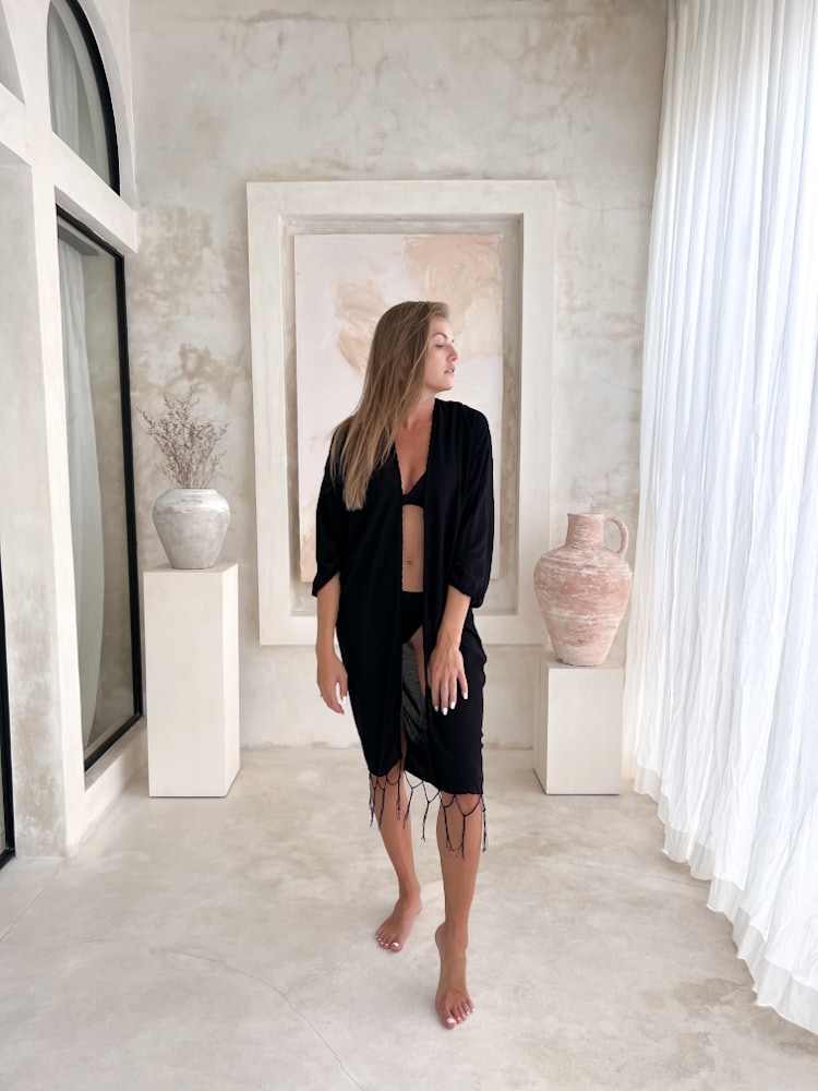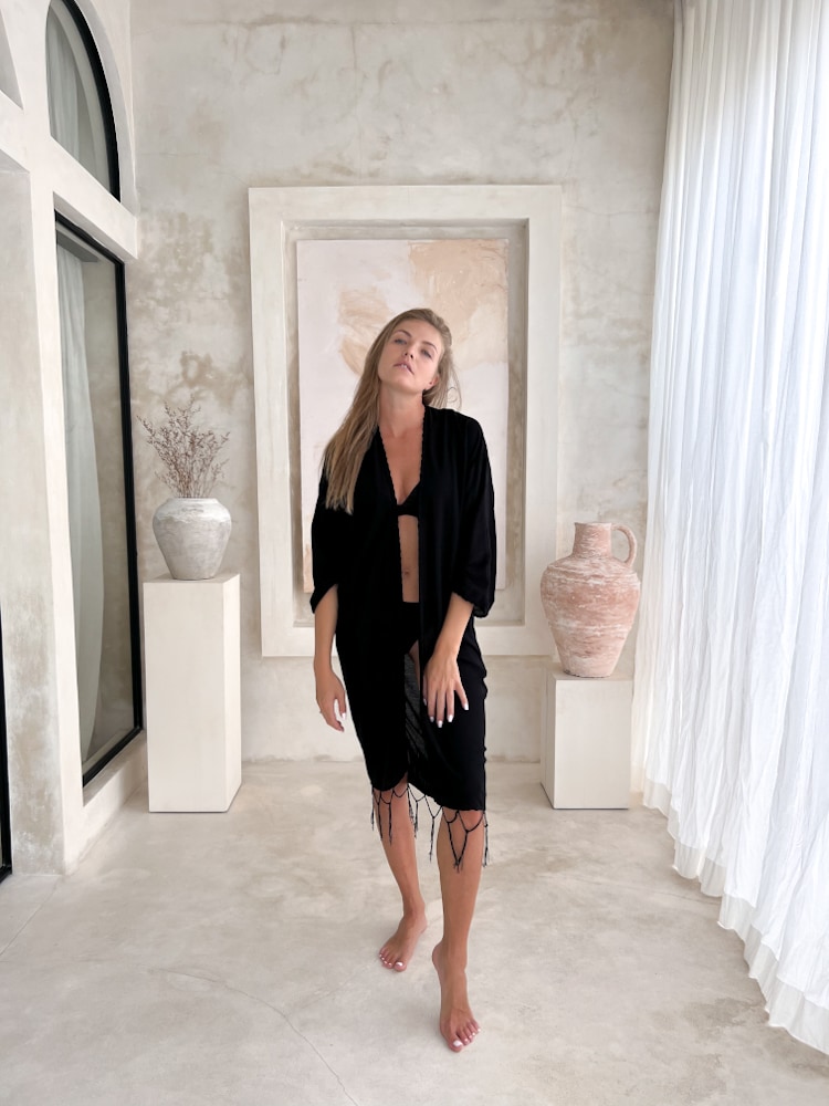 Strandüberwurf ARIS Schwarz ist ein handgefertigtes Produkt aus Bali. Dieser elegante schwarze Strandüberwurf im Boho-Stil ist ideal für sommerliche Outfits und als leichtes Strandaccessoire. Hergestellt von lokalen Kunsthandwerkern, bietet dieser Überwurf sowohl Stil als auch Komfort. Unsere Produkte stammen direkt von vertrauenswürdigen Lieferanten, die wir persönlich kennen.