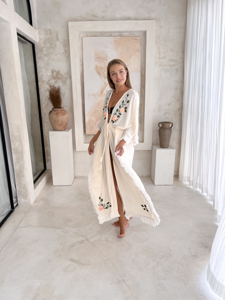 Strandüberwurf MIA LANG Creme ist ein handgefertigtes Produkt aus Bali. Dieser elegante lange cremefarbene Strandüberwurf im Boho-Stil ist ideal für sommerliche Outfits und als leichtes Strandaccessoire. Hergestellt von lokalen Kunsthandwerkern, bietet dieser Überwurf sowohl Stil als auch Komfort. Unsere Produkte stammen direkt von vertrauenswürdigen Lieferanten, die wir persönlich kennen.