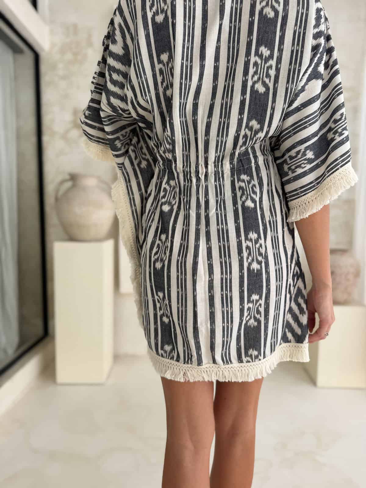 Beschreibung: Kurzes Kimono mit Fransen, schwarz-weiß, im Boho-Stil