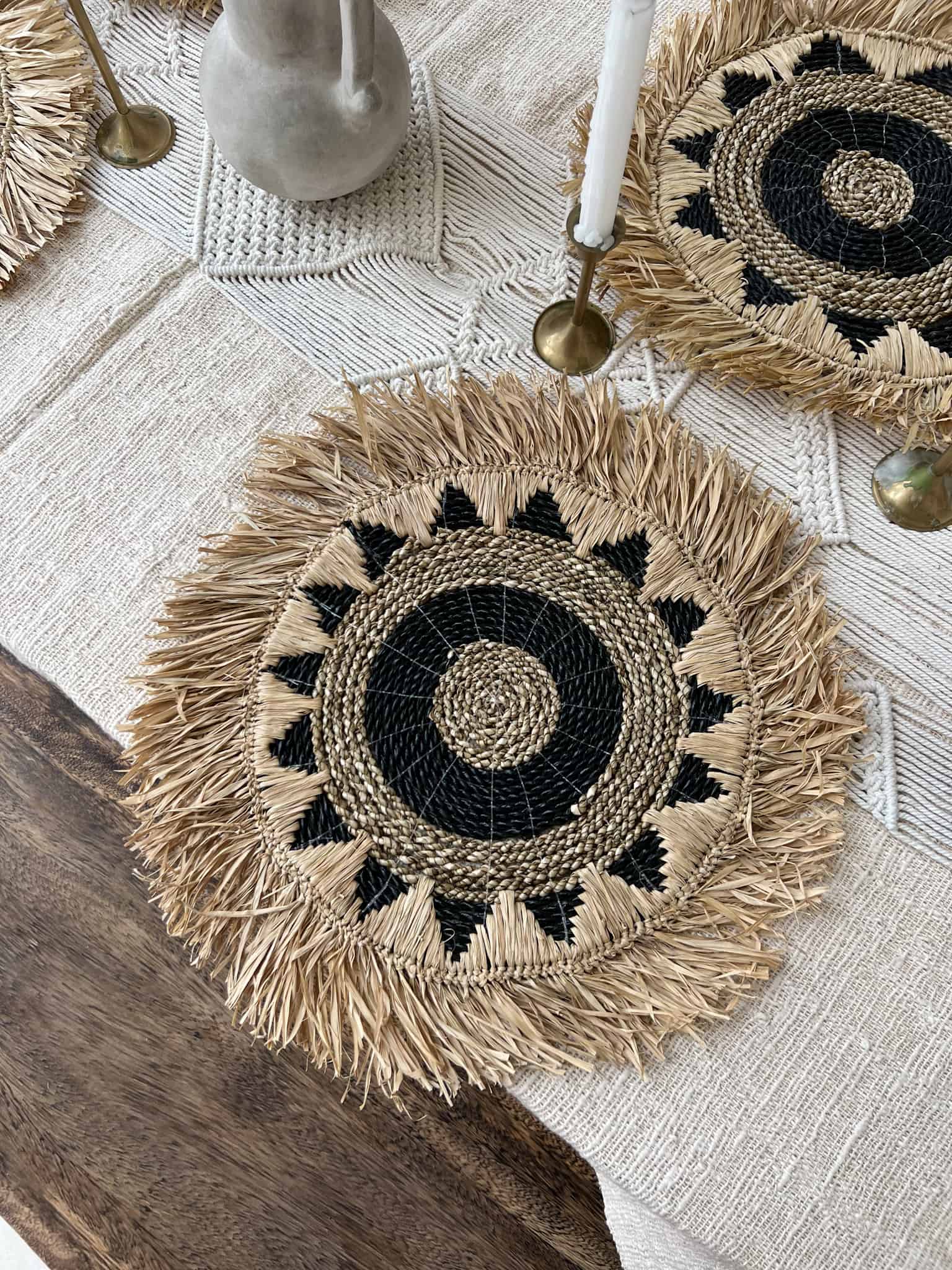 Tischset Boho DENI – Das boho DENI Tischset ist ein Meisterwerk handgemachter Tischdekoration, das die Esskultur Balis in dein Zuhause bringt. Jedes Stück ist ein Ausdruck von Kreativität und Handwerkskunst, gefertigt von Künstlern, die ihre Umwelt respektieren und schützen. Diese umweltfreundlichen Tischdekorationen sind nicht nur nachhaltig, sondern bringen auch eine rustikale und einzigartige Schönheit auf jeden Tisch. Die rustikalen Tischdekor Elemente kombinieren traditionelle Techniken mit einem einzigartigen Designansatz, was sie zu wahren Unikaten macht.