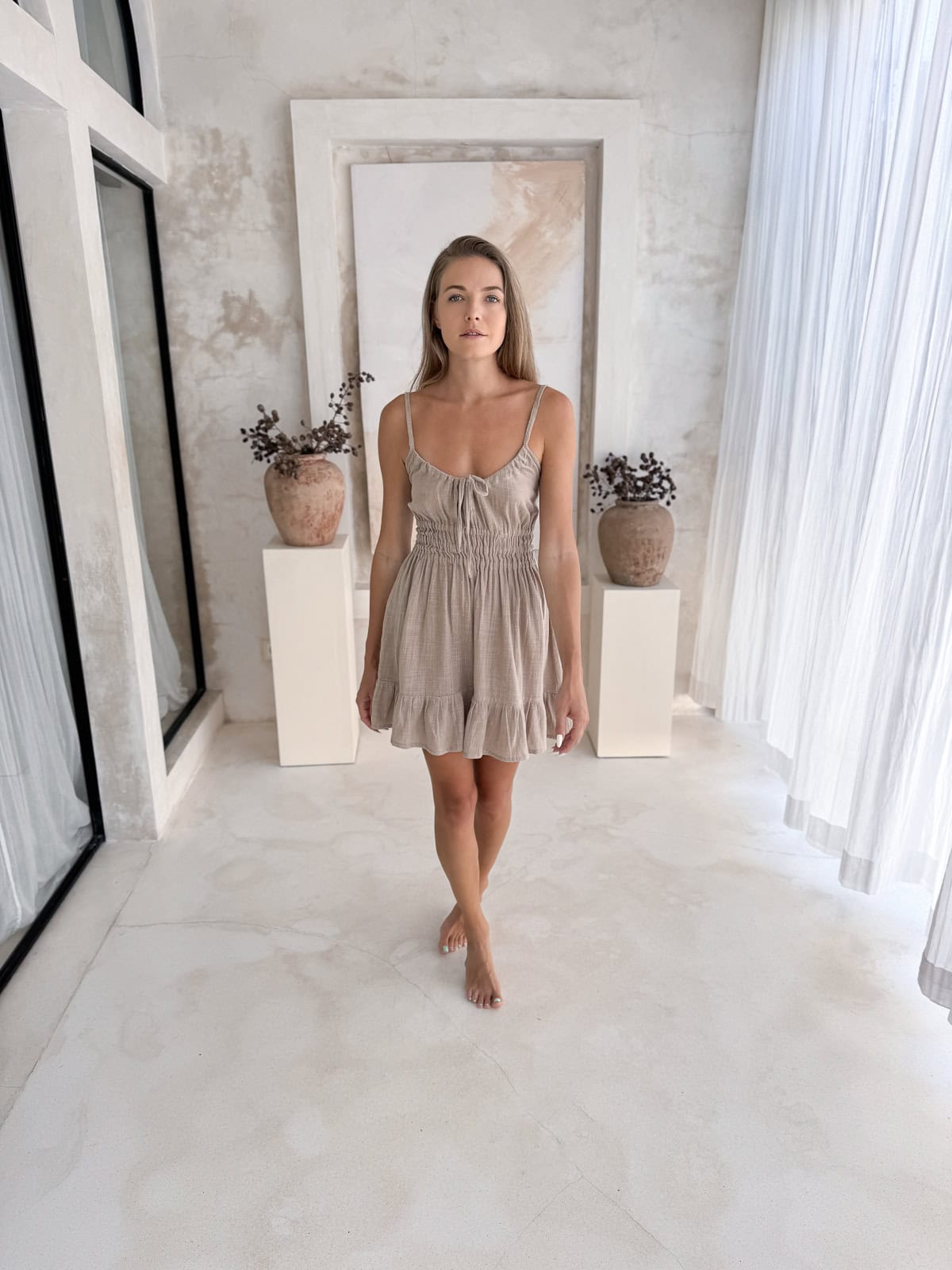 Ein kurzes Trägerkleid mit lockerem Fall, der schön umspielt. Der Beige-Ton wirkt natürlich und zurückhaltend – ideal für Boho-Casual oder minimalistische Looks.