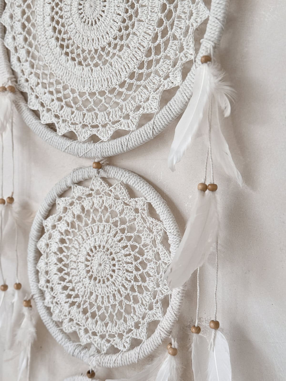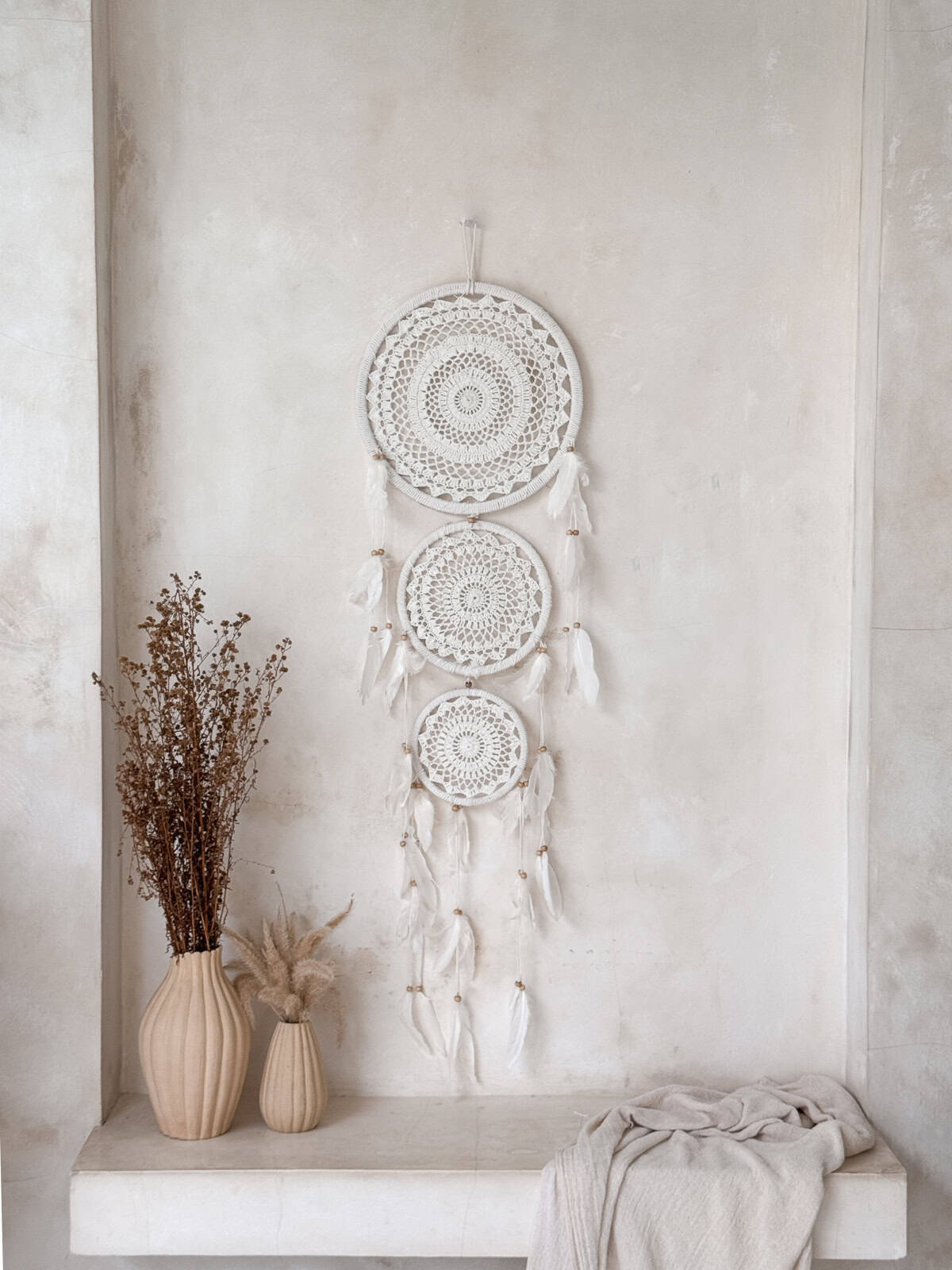 Beschreibung: Handgearbeiteter Traumfänger mit drei Ringen, Boho-Stil